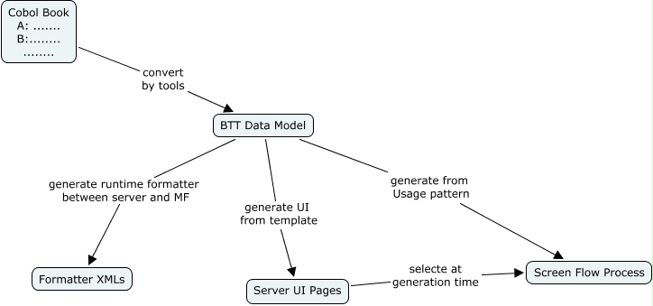此概念图以 IHMC CmapTools 创建, 内含信息有关于: generation, BTT Data Model generate UI from template Server UI Pages, BTT Data Model generate runtime formatter between server and MF Formatter XMLs, Server UI Pages selecte at generation time Screen Flow Process, BTT Data Model generate from Usage pattern Screen Flow Process, Cobol Book A: ....... B:........ ........ convert by tools BTT Data Model