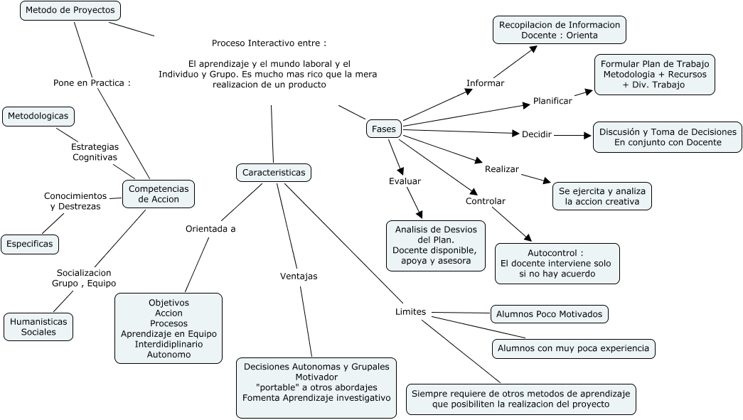 Este Cmap, tiene información relacionada con: MetodoDeProyecto, Fases Planificar Formular Plan de Trabajo Metodologia + Recursos + Div. Trabajo, Metodo de Proyectos Pone en Practica : Competencias de Accion, Caracteristicas Orientada a Objetivos Accion Procesos Aprendizaje en Equipo Interdidiplinario Autonomo, Caracteristicas Limites Alumnos con muy poca experiencia, Humanisticas Sociales Socializacion Grupo , Equipo Competencias de Accion, Metodologicas Estrategias Cognitivas Competencias de Accion, Fases Realizar Se ejercita y analiza la accion creativa, Metodo de Proyectos Proceso Interactivo entre : El aprendizaje y el mundo laboral y el Individuo y Grupo. Es mucho mas rico que la mera realizacion de un producto Caracteristicas, Especificas Conocimientos y Destrezas Competencias de Accion, Metodo de Proyectos Proceso Interactivo entre : El aprendizaje y el mundo laboral y el Individuo y Grupo. Es mucho mas rico que la mera realizacion de un producto Fases, Fases Evaluar Analisis de Desvios del Plan. Docente disponible, apoya y asesora, Fases Decidir Discusión y Toma de Decisiones En conjunto con Docente, Fases Controlar Autocontrol : El docente interviene solo si no hay acuerdo, Caracteristicas Limites Alumnos Poco Motivados, Caracteristicas Limites Siempre requiere de otros metodos de aprendizaje que posibiliten la realizacion del proyecto, Caracteristicas Ventajas Decisiones Autonomas y Grupales Motivador "portable" a otros abordajes Fomenta Aprendizaje investigativo, Fases Informar Recopilacion de Informacion Docente : Orienta