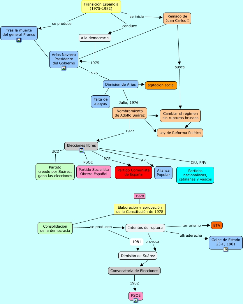 Este Cmap, tiene información relacionada con: transicion.cmap, 1978 ???? Elaboración y aprobación de la Constitución de 1978, Elecciones libres PSOE Partido Socialista Obrero Español, Elaboración y aprobación de la Constitución de 1978 ???? ????, 1981 ???? Dimisión de Suárez, Cambiar el régimen sin rupturas bruscas ???? Ley de Reforma Política, Consolidación de la democracia se producen Intentos de ruptura, Transición Española (1975-1982) conduce a la democracia, Dimisión de Arias ???? Falta de apoyos, Dimisión de Arias ???? agitacion social, Elecciones libres UCD Partido creado por Suárez, gana las elecciones, Intentos de ruptura terrorismo ETA, Elecciones libres CiU, PNV Partidos nacionalistas, catalanes y vascos, Arias Navarro Presidente del Gobierno 1976 Dimisión de Arias, Intentos de ruptura ultraderecha Golpe de Estado 23-F, 1981, Elecciones libres AP Alianza Popular, Dimisión de Suárez ???? Convocatoria de Elecciones, Transición Española (1975-1982) se produce Tras la muerte del general Franco, Consolidación de la democracia se producen 1981, Transición Española (1975-1982) se inicia Reinado de Juan Carlos I, Reinado de Juan Carlos I busca Cambiar el régimen sin rupturas bruscas