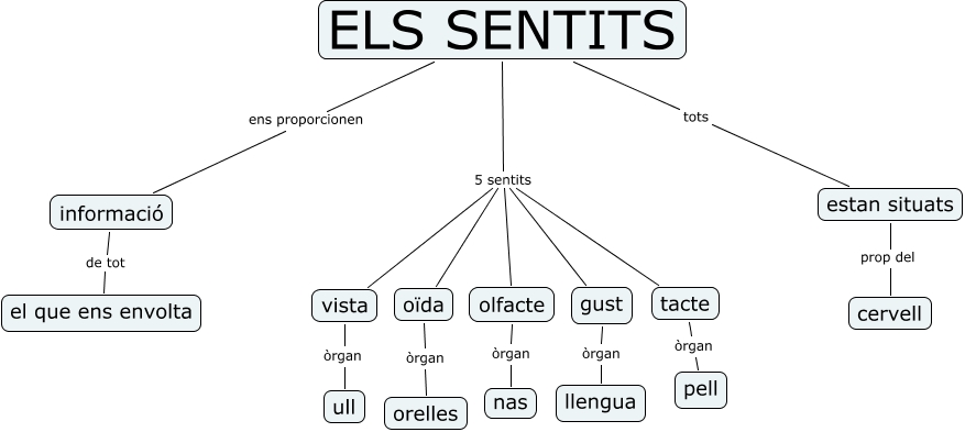 Este Cmap, tiene información relacionada con: els sentits, olfacte òrgan nas, gust òrgan llengua, ELS SENTITS 5 sentits vista, ELS SENTITS 5 sentits olfacte, ELS SENTITS 5 sentits tacte, ELS SENTITS 5 sentits gust, informació de tot el que ens envolta, ELS SENTITS ens proporcionen informació, oïda òrgan orelles, ELS SENTITS 5 sentits oïda, estan situats prop del cervell, tacte òrgan pell, ELS SENTITS tots estan situats, vista òrgan ull