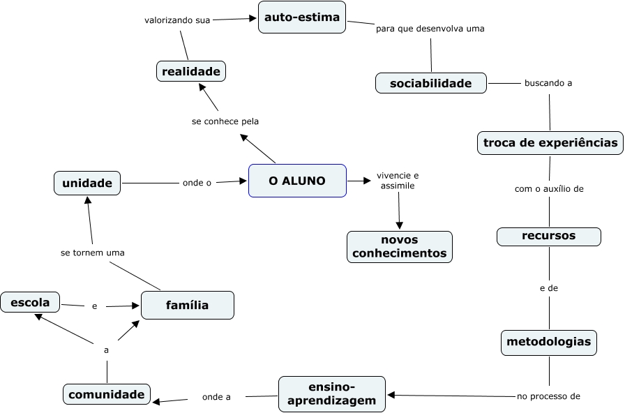 Esse mapa conceitual, produzido no IHMC CmapTools, tem a informação relacionada a: ALUNO, unidade onde o O ALUNO, sociabilidade buscando a troca de experiências, metodologias no processo de ensino- aprendizagem, ensino- aprendizagem onde a comunidade, escola e família, família se tornem uma unidade, O ALUNO vivencie e assimile novos conhecimentos, comunidade a família, auto-estima para que desenvolva uma sociabilidade, realidade valorizando sua auto-estima, recursos e de metodologias, troca de experiências com o auxílio de recursos, O ALUNO se conhece pela realidade, comunidade a escola