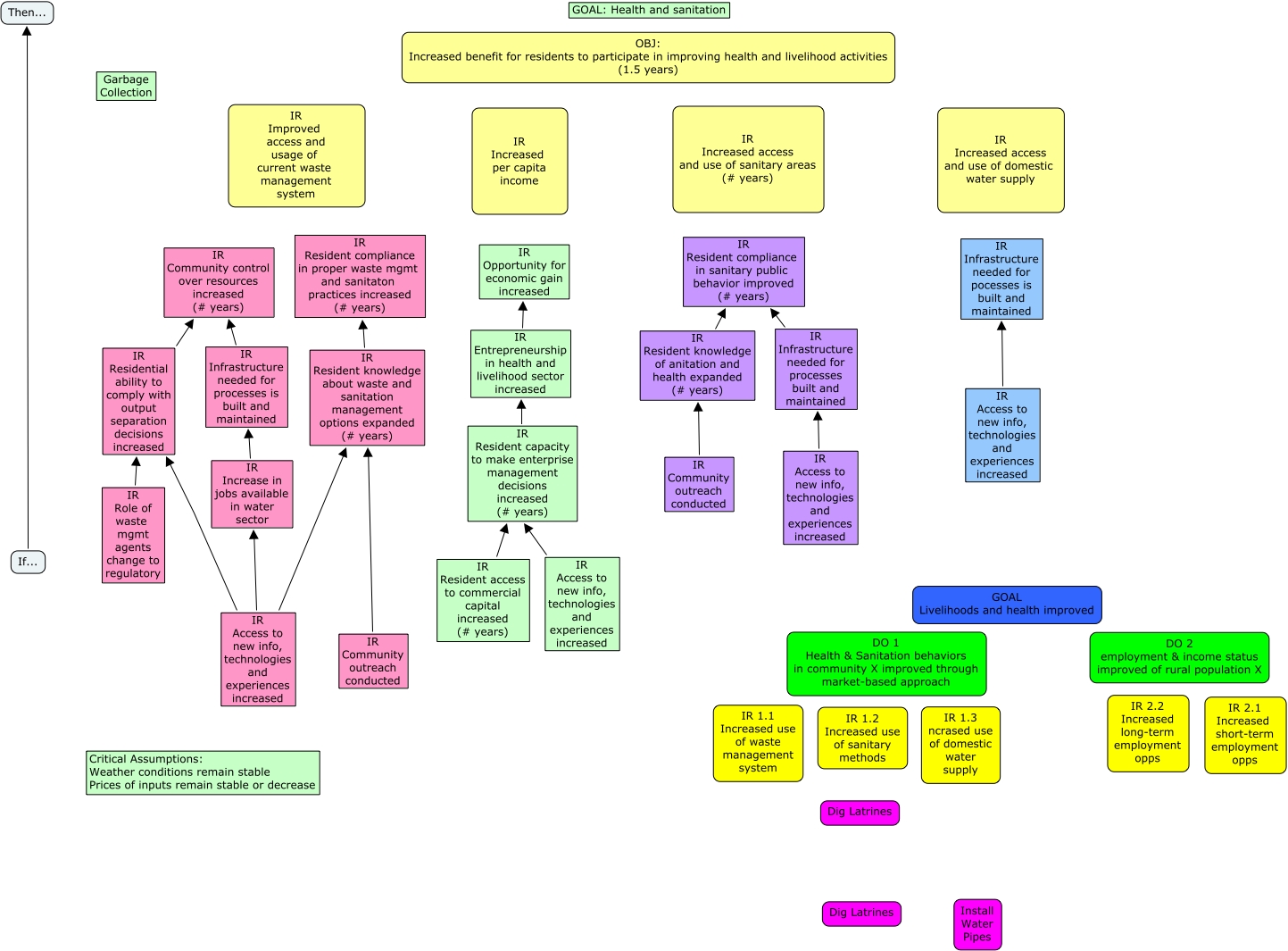 This Concept Map, created with IHMC CmapTools, has information related to: Urbs Liberia, IR Access to new info, technologies and experiences increased IR Residential ability to comply with output separation decisions increased, IR Access to new info, technologies and experiences increased IR Resident capacity to make enterprise management decisions increased (# years), IR Resident capacity to make enterprise management decisions increased (# years) IR Entrepreneurship in health and livelihood sector increased, IR Entrepreneurship in health and livelihood sector increased IR Opportunity for economic gain increased, IR Access to new info, technologies and experiences increased IR Infrastructure needed for processes built and maintained, IR Access to new info, technologies and experiences increased IR Resident knowledge about waste and sanitation management options expanded (# years), IR Resident knowledge about waste and sanitation management options expanded (# years) IR Resident compliance in proper waste mgmt and sanitaton practices increased (# years), IR Access to new info, technologies and experiences increased IR Increase in jobs available in water sector, IR Community outreach conducted IR Resident knowledge about waste and sanitation management options expanded (# years), IR Resident access to commercial capital increased (# years) IR Resident capacity to make enterprise management decisions increased (# years), IR Infrastructure needed for processes is built and maintained IR Community control over resources increased (# years), IR Infrastructure needed for processes built and maintained IR Resident compliance in sanitary public behavior improved (# years), If... Then..., IR Increase in jobs available in water sector IR Infrastructure needed for processes is built and maintained, IR Role of waste mgmt agents change to regulatory IR Residential ability to comply with output separation decisions increased, IR Access to new info, technologies and experiences increased IR Infrastructure needed for pocesses is built and maintained, IR Residential ability to comply with output separation decisions increased IR Community control over resources increased (# years), IR Resident knowledge of anitation and health expanded (# years) IR Resident compliance in sanitary public behavior improved (# years), IR Community outreach conducted IR Resident knowledge of anitation and health expanded (# years)