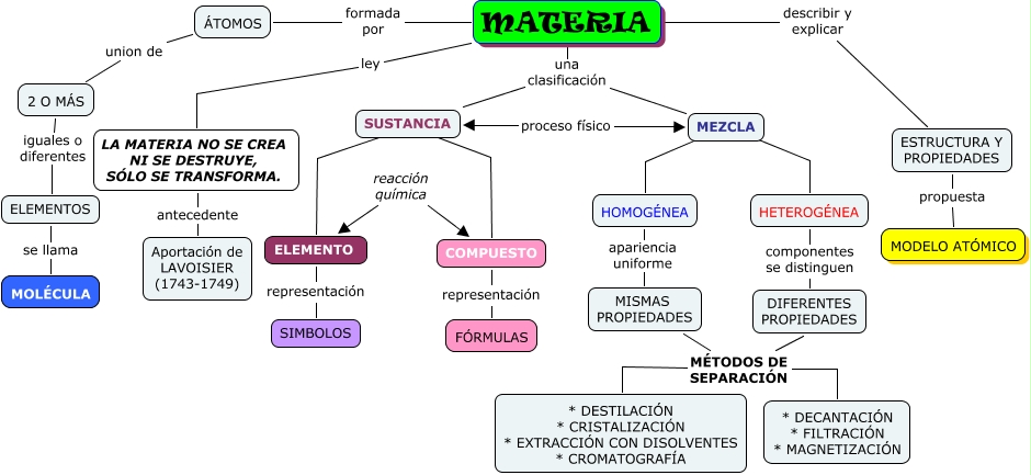 Este Cmap, tiene información relacionada con: C3.B1.Materia, HOMOGÉNEA apariencia uniforme MISMAS PROPIEDADES, ESTRUCTURA Y PROPIEDADES propuesta MODELO ATÓMICO, MISMAS PROPIEDADES MÉTODOS DE SEPARACIÓN * DESTILACIÓN * CRISTALIZACIÓN * EXTRACCIÓN CON DISOLVENTES * CROMATOGRAFÍA, MATERIA formada por ÁTOMOS, MEZCLA ???? HOMOGÉNEA, LA MATERIA NO SE CREA NI SE DESTRUYE, SÓLO SE TRANSFORMA. antecedente Aportación de LAVOISIER (1743-1749), SUSTANCIA ???? COMPUESTO, HETEROGÉNEA componentes se distinguen DIFERENTES PROPIEDADES, MISMAS PROPIEDADES MÉTODOS DE SEPARACIÓN DIFERENTES PROPIEDADES, MISMAS PROPIEDADES MÉTODOS DE SEPARACIÓN * DECANTACIÓN * FILTRACIÓN * MAGNETIZACIÓN, ELEMENTOS se llama MOLÉCULA, MATERIA ley LA MATERIA NO SE CREA NI SE DESTRUYE, SÓLO SE TRANSFORMA., MEZCLA ???? HETEROGÉNEA, MATERIA una clasificación SUSTANCIA, MATERIA una clasificación MEZCLA, SUSTANCIA ???? ELEMENTO, ELEMENTO representación SIMBOLOS, COMPUESTO representación FÓRMULAS, MATERIA describir y explicar ESTRUCTURA Y PROPIEDADES, 2 O MÁS iguales o diferentes ELEMENTOS