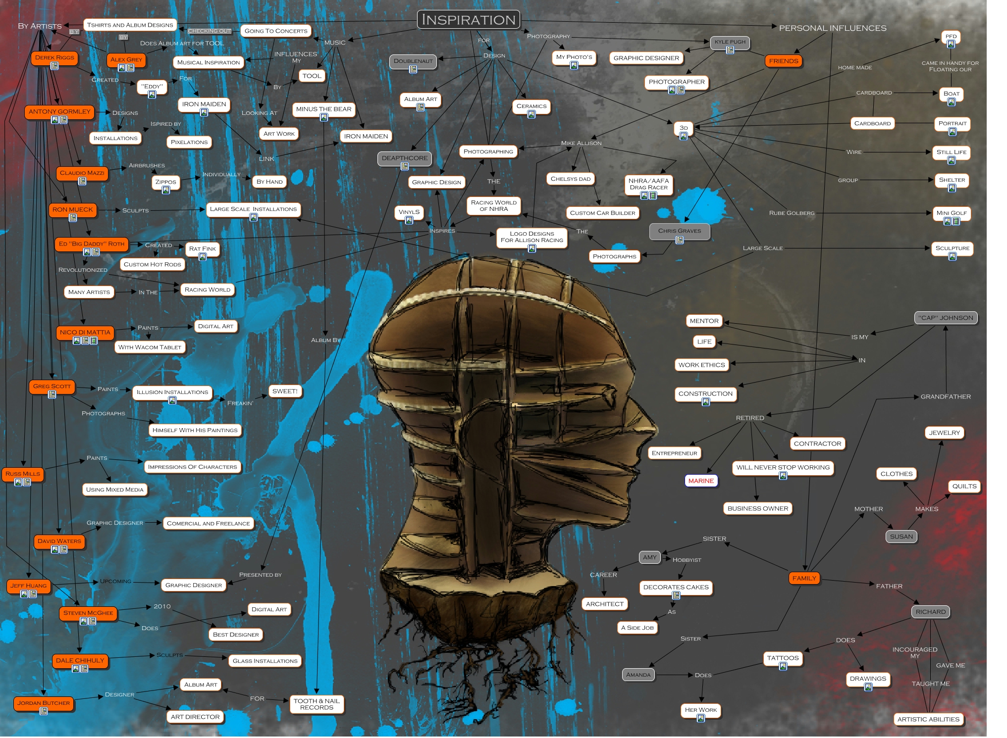 This Concept Map, created with IHMC CmapTools, has information related to: Chad Hammontree Cmap revised.cmap, FAMILY Sister Amanda, Inspiration MUSIC IRON MAIDEN, Inspiration By Artists David Waters, NICO DI MATTIA Paints With Wacom Tablet, Inspiration Design Graphic Design, Racing World of NHRA Inspires Graphic Design, Alex Grey By Artists ANTONY GORMLEY, RICHARD DOES TATTOOS, "CAP" JOHNSON RETIRED Entrepreneur, RON MUECK Sculpts Large Scale Installations, Alex Grey By Artists Jeff Huang, Alex Grey By Artists Claudio Mazzi, DALE CHIHULY Sculpts Glass Installations, Greg Scott Photographs Himself With His Paintings, Greg Scott Paints Illusion Installations, SUSAN MAKES QUILTS, Inspiration Design DEAPTHCORE, FRIENDS Mike Allison Custom Car Builder, "Eddy" For IRON MAIDEN, Alex Grey By Artists NICO DI MATTIA