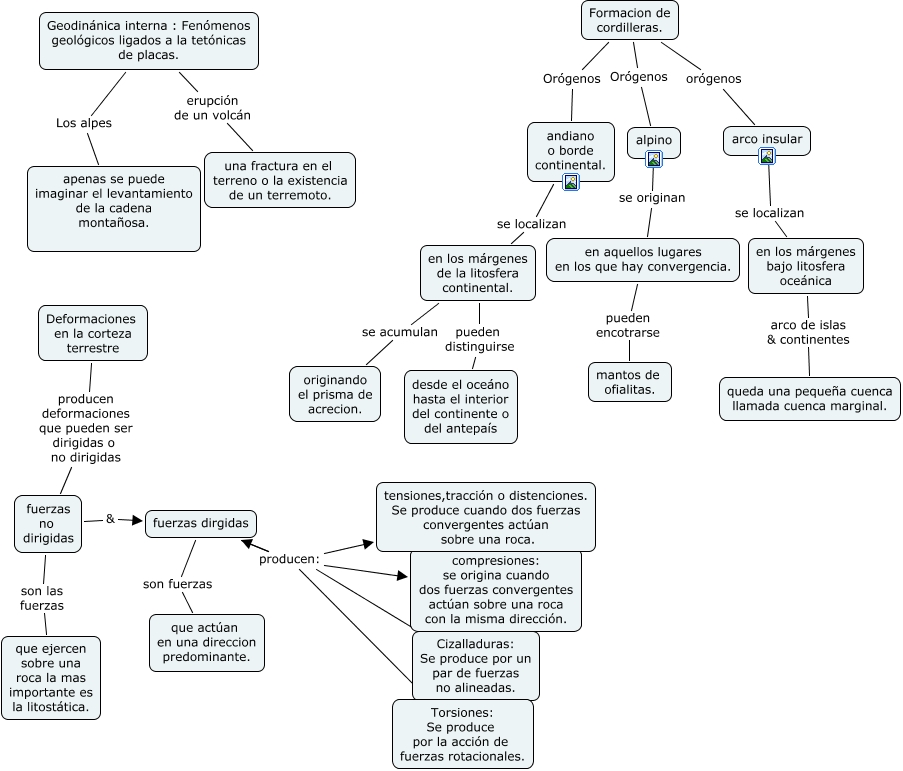Este Cmap, tiene información relacionada con: geodinámica interna, en los márgenes bajo litosfera oceánica arco de islas & continentes queda una pequeña cuenca llamada cuenca marginal., Formacion de cordilleras. Orógenos alpino, fuerzas dirgidas producen: Cizalladuras: Se produce por un par de fuerzas no alineadas., Formacion de cordilleras. Orógenos andiano o borde continental., Geodinánica interna : Fenómenos geológicos ligados a la tetónicas de placas. Los alpes apenas se puede imaginar el levantamiento de la cadena montañosa., fuerzas dirgidas producen: compresiones: se origina cuando dos fuerzas convergentes actúan sobre una roca con la misma dirección., fuerzas no dirigidas son las fuerzas que ejercen sobre una roca la mas importante es la litostática., Deformaciones en la corteza terrestre producen deformaciones que pueden ser dirigidas o no dirigidas fuerzas no dirigidas, arco insular se localizan en los márgenes bajo litosfera oceánica, andiano o borde continental. se localizan en los márgenes de la litosfera continental., en aquellos lugares en los que hay convergencia. pueden encotrarse mantos de ofialitas., fuerzas no dirigidas & fuerzas dirgidas, en los márgenes de la litosfera continental. se acumulan originando el prisma de acrecion., en los márgenes de la litosfera continental. pueden distinguirse desde el oceáno hasta el interior del continente o del antepaís, alpino se originan en aquellos lugares en los que hay convergencia., fuerzas dirgidas son fuerzas que actúan en una direccion predominante., Geodinánica interna : Fenómenos geológicos ligados a la tetónicas de placas. erupción de un volcán una fractura en el terreno o la existencia de un terremoto., fuerzas dirgidas producen: tensiones,tracción o distenciones. Se produce cuando dos fuerzas convergentes actúan sobre una roca., fuerzas dirgidas producen: Torsiones: Se produce por la acción de fuerzas rotacionales., Formacion de cordilleras. orógenos arco insular