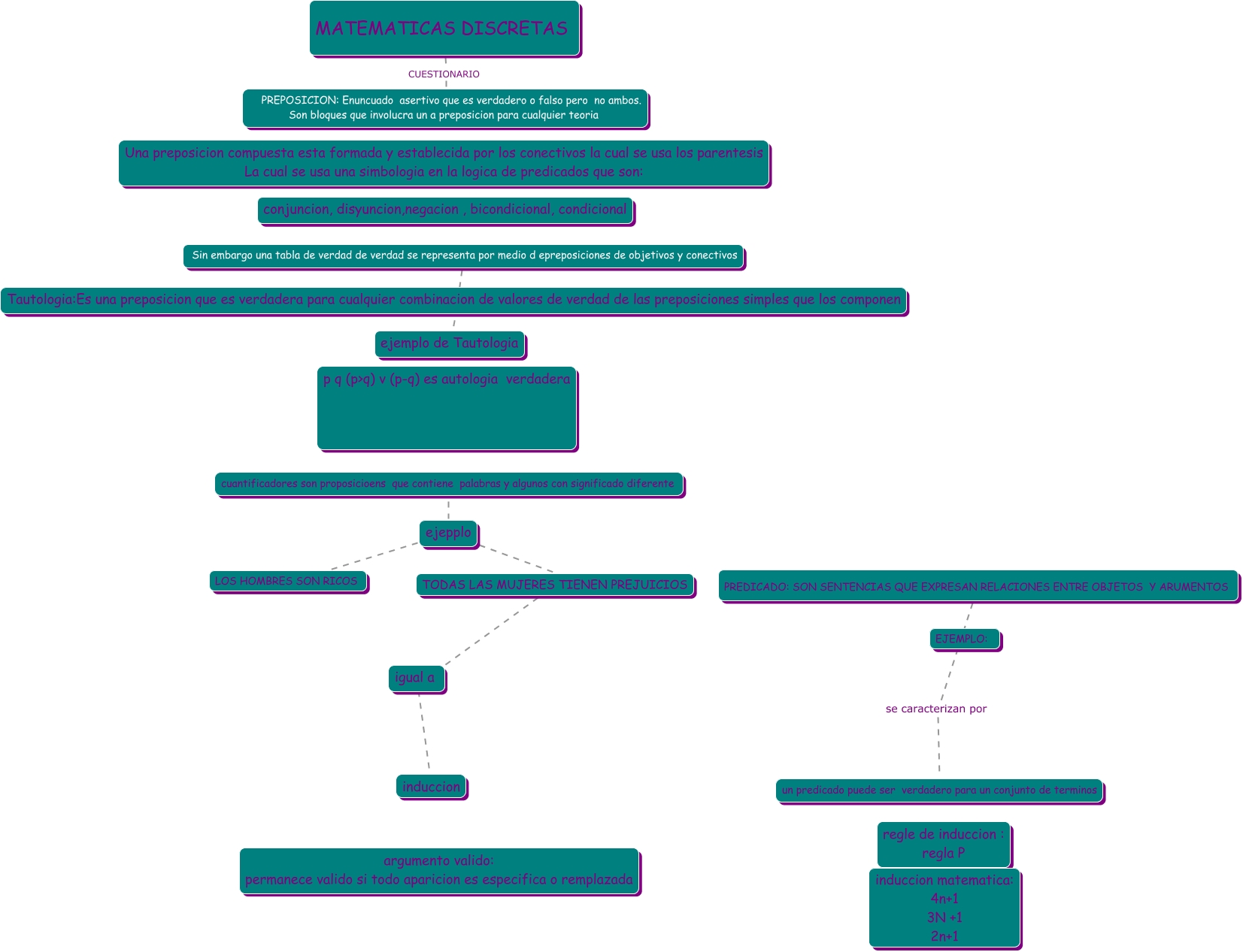 Este Cmap, tiene información relacionada con: comunicacio, MATEMATICAS DISCRETAS CUESTIONARIO PREPOSICION: Enuncuado asertivo que es verdadero o falso pero no ambos. Son bloques que involucra un a preposicion para cualquier teoria, PREDICADO: SON SENTENCIAS QUE EXPRESAN RELACIONES ENTRE OBJETOS Y ARUMENTOS se caracterizan por un predicado puede ser verdadero para un conjunto de terminos, ejepplo ???? TODAS LAS MUJERES TIENEN PREJUICIOS, Sin embargo una tabla de verdad de verdad se representa por medio d epreposiciones de objetivos y conectivos ???? ejemplo de Tautologia, TODAS LAS MUJERES TIENEN PREJUICIOS ???? induccion, ejepplo ???? LOS HOMBRES SON RICOS, cuantificadores son proposicioens que contiene palabras y algunos con significado diferente son ejepplo