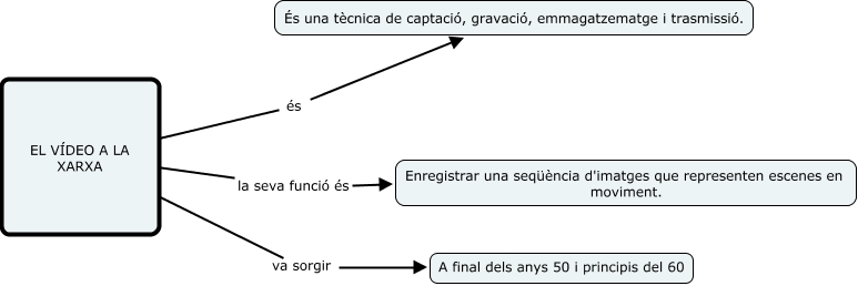 Este Cmap, tiene información relacionada con: EL VÍDEO A LA XARXA ( dEFINICIÓ I HISTÒRIA), EL VÍDEO A LA XARXA és És una tècnica de captació, gravació, emmagatzematge i trasmissió., EL VÍDEO A LA XARXA va sorgir A final dels anys 50 i principis del 60, EL VÍDEO A LA XARXA la seva funció és Enregistrar una seqüència d'imatges que representen escenes en moviment.