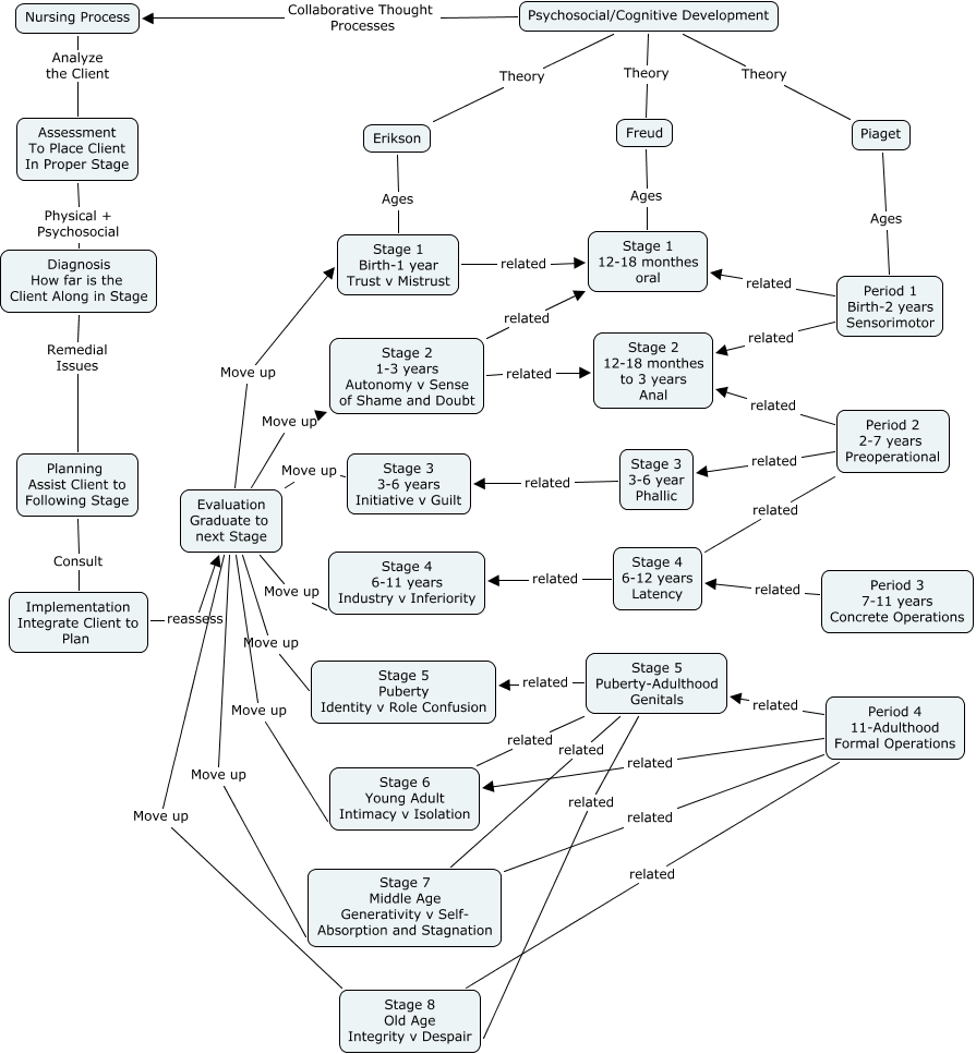This Concept Map, created with IHMC CmapTools, has information related to: Development and The Nursing Process, Evaluation Graduate to next Stage Move up Stage 3 3-6 years Initiative v Guilt, Stage 1 Birth-1 year Trust v Mistrust related Stage 1 12-18 monthes oral, Psychosocial/Cognitive Development Collaborative Thought Processes Nursing Process, Implementation Integrate Client to Plan reassess Evaluation Graduate to next Stage, Evaluation Graduate to next Stage Move up Stage 1 Birth-1 year Trust v Mistrust, Period 1 Birth-2 years Sensorimotor related Stage 2 12-18 monthes to 3 years Anal, Freud Ages Stage 1 12-18 monthes oral, Period 4 11-Adulthood Formal Operations related Stage 8 Old Age Integrity v Despair, Period 2 2-7 years Preoperational related Stage 2 12-18 monthes to 3 years Anal, Evaluation Graduate to next Stage Move up Stage 2 1-3 years Autonomy v Sense of Shame and Doubt, Psychosocial/Cognitive Development Theory Erikson, Stage 5 Puberty-Adulthood Genitals related Stage 8 Old Age Integrity v Despair, Period 4 11-Adulthood Formal Operations related Stage 5 Puberty-Adulthood Genitals, Period 2 2-7 years Preoperational related Stage 4 6-12 years Latency, Evaluation Graduate to next Stage Move up Stage 6 Young Adult Intimacy v Isolation, Assessment To Place Client In Proper Stage Physical + Psychosocial Diagnosis How far is the Client Along in Stage, Stage 5 Puberty-Adulthood Genitals related Stage 5 Puberty Identity v Role Confusion, Diagnosis How far is the Client Along in Stage Remedial Issues Planning Assist Client to Following Stage, Evaluation Graduate to next Stage Move up Stage 7 Middle Age Generativity v Self- Absorption and Stagnation, Period 4 11-Adulthood Formal Operations related Stage 6 Young Adult Intimacy v Isolation