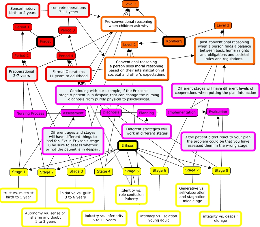 This Concept Map, created with IHMC CmapTools, has information related to: Nursing Theories, Barney, If the patient didn't react to your plan, the problem could be that you have assessed them in the wrong stage. ???? Evaluation, Erikson ???? Stage 2, industry vs. inferiority 6 to 11 years ???? Stage 4, post-conventional reasoning when a person finds a balance between basic human rights and obligations and societal rules and regulations. ???? Stage 7, Period 4 ???? Formal Operations 11 years to adulthood, Preoperational 2-7 years ???? Pre-conventional reasoning when children ask why, Erikson ???? Stage 1, Piaget ???? Period 4, Initiative vs. guilt 3 to 6 years ???? Stage 3, Kohlberg ???? Level 2, Stage 4 a Period 3, Stage 2 ???? Autonomy vs. sense of shame and doubt 1 to 3 years, Erikson ???? Stage 8, Sensorimotor, birth to 2 years ???? Pre-conventional reasoning when children ask why, Erikson ???? Stage 3, Level 2 ???? Conventional reasoning a person sees moral reasoning based on their internalization of societal and other's expectations, concrete operations 7-11 years ???? Conventional reasoning a person sees moral reasoning based on their internalization of societal and other's expectations, Period 2 ???? Preoperational 2-7 years, Stage 6 a Period 4, Stage 5 a Period 4