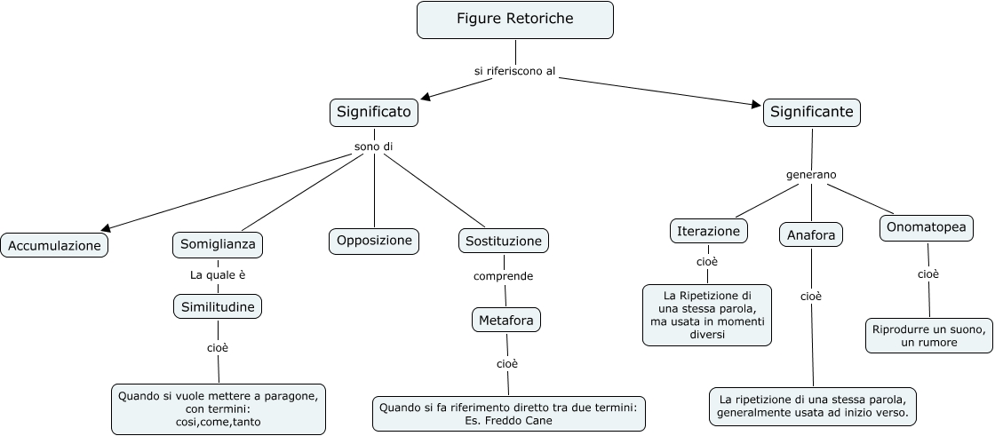 Questa Cmap, creata con IHMC CmapTools, contiene informazioni relative a: Figure Retoriche, Similitudine cioè Quando si vuole mettere a paragone, con termini: cosi,come,tanto, Significante generano Iterazione, Significato sono di Sostituzione, Metafora cioè Quando si fa riferimento diretto tra due termini: Es. Freddo Cane, Significante generano Anafora, Significato sono di Somiglianza, Significato sono di Accumulazione, Anafora cioè La ripetizione di una stessa parola, generalmente usata ad inizio verso., Somiglianza La quale è Similitudine, Significante generano Onomatopea, Onomatopea cioè Riprodurre un suono, un rumore, Figure Retoriche si riferiscono al Significante, Iterazione cioè La Ripetizione di una stessa parola, ma usata in momenti diversi, Sostituzione comprende Metafora, Figure Retoriche si riferiscono al Significato, Significato sono di Opposizione