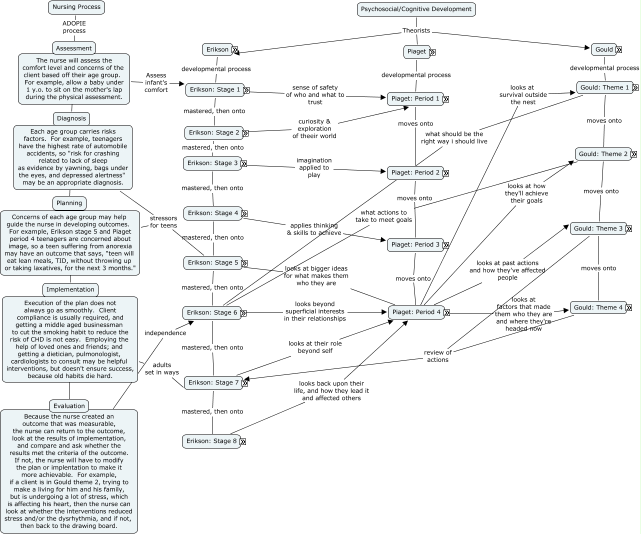 This Concept Map, created with IHMC CmapTools, has information related to: Developmental Parking Lot - Dwayne Yee.cmap, Execution of the plan does not always go as smoothly. Client compliance is usually required, and getting a middle aged businessman to cut the smoking habit to reduce the risk of CHD is not easy. Employing the help of loved ones and friends; and getting a dietician, pulmonologist, cardiologists to consult may be helpful interventions, but doesn't ensure success, because old habits die hard. adults set in ways Erikson: Stage 7, Erikson: Stage 4 mastered, then onto Erikson: Stage 5, Piaget: Period 4 looks at how they'll achieve their goals Gould: Theme 2, Erikson: Stage 4 applies thinking & skills to achieve Piaget: Period 3, Gould developmental process Gould: Theme 1, Psychosocial/Cognitive Development Theorists Gould, Erikson: Stage 8 looks back upon their life, and how they lead it and affected others Piaget: Period 4, Erikson developmental process Erikson: Stage 1, Assessment ???? Diagnosis, Piaget: Period 4 looks at survival outside the nest Gould: Theme 1, Nursing Process ADOPIE process Assessment, Planning ???? Implementation, Erikson: Stage 6 looks beyond superficial interests in their relationships Piaget: Period 4, Because the nurse created an outcome that was measurable, the nurse can return to the outcome, look at the results of implementation, and compare and ask whether the results met the criteria of the outcome. If not, the nurse will have to modify the plan or implentation to make it more achievable. For example, if a client is in Gould theme 2, trying to make a living for him and his family, but is undergoing a lot of stress, which is affecting his heart, then the nurse can look at whether the interventions reduced stress and/or the dysrhythmia, and if not, then back to the drawing board. independence Erikson: Stage 6, Erikson: Stage 6 mastered, then onto Erikson: Stage 7, Erikson: Stage 7 mastered, then onto Erikson: Stage 8, Piaget developmental process Piaget: Period 1, Erikson: Stage 5 looks at bigger ideas for what makes them who they are Piaget: Period 4, Erikson: Stage 1 mastered, then onto Erikson: Stage 2, Psychosocial/Cognitive Development Theorists Piaget