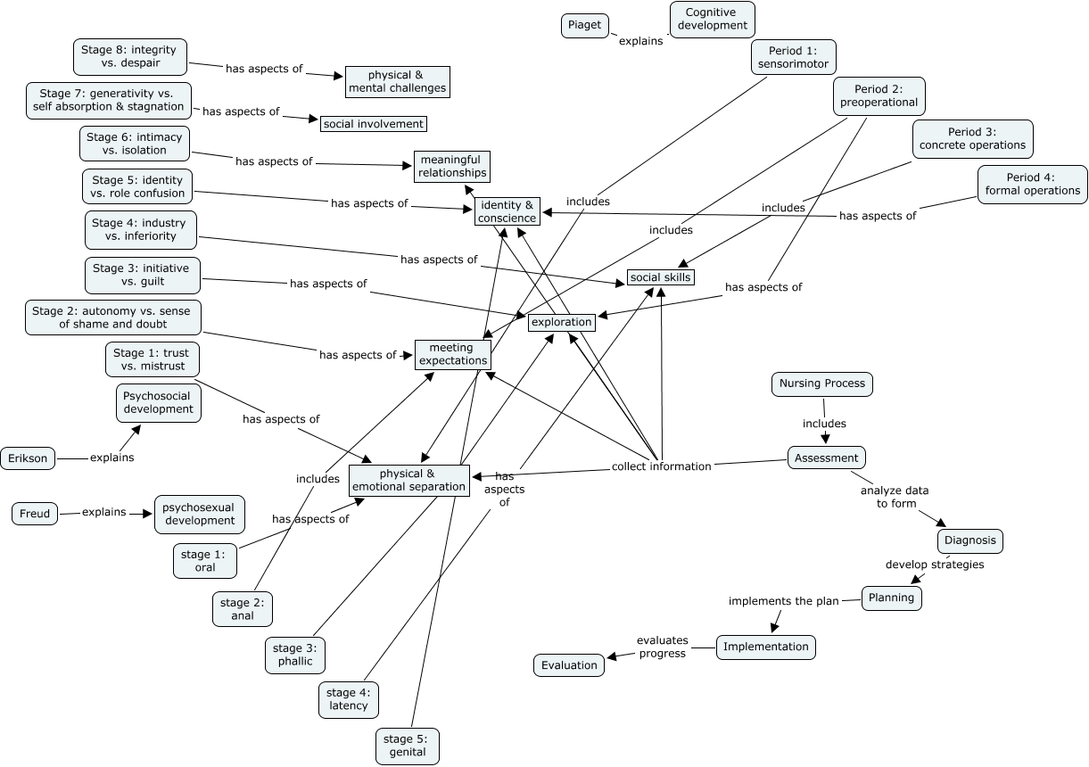 This Concept Map, created with IHMC CmapTools, has information related to: Developmental stages_Vu, stage 4: latency has aspects of social skills, Freud explains psychosexual development, Assessment collect information meaningful relationships, Implementation evaluates progress Evaluation, Assessment analyze data to form Diagnosis, Piaget explains Cognitive development, Period 1: sensorimotor includes physical & emotional separation, stage 1: oral has aspects of physical & emotional separation, stage 3: phallic ???? exploration, Assessment collect information identity & conscience, Period 4: formal operations has aspects of identity & conscience, Nursing Process includes Assessment, Stage 3: initiative vs. guilt has aspects of exploration, stage 2: anal includes meeting expectations, Planning implements the plan Implementation, Stage 5: identity vs. role confusion has aspects of identity & conscience, stage 5: genital ???? identity & conscience, Assessment collect information exploration, Period 3: concrete operations includes social skills, Stage 8: integrity vs. despair has aspects of physical & mental challenges