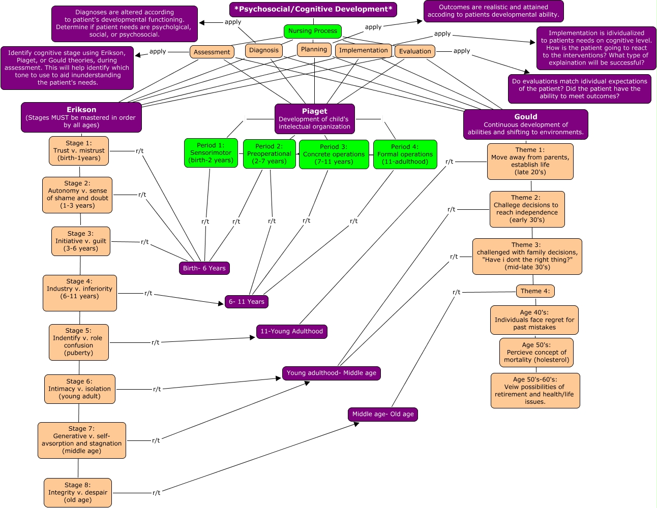 This Concept Map, created with IHMC CmapTools, has information related to: DevelopmentGodfrey, Diagnosis ???? Gould Continuous development of abilities and shifting to environments., Assessment ???? Piaget Development of child's intelectual organization, Gould Continuous development of abilities and shifting to environments. ???? Theme 1: Move away from parents, establish life (late 20's), Theme 3: challenged with family decisions, "Have i dont the right thing?" (mid-late 30's) r/t Young adulthood- Middle age, Period 2: Preoperational (2-7 years) r/t Birth- 6 Years, Implementation apply Implementation is idividualized to patients needs on cognitive level. How is the patient going to react to the interventions? What type of explaination will be successful?, Stage 6: Intimacy v. isolation (young adult) r/t Young adulthood- Middle age, Erikson (Stages MUST be mastered in order by all ages) ???? Stage 1: Trust v. mistrust (birth-1years), Theme 4: ???? Age 40's: Individuals face regret for past mistakes, Diagnosis ???? Erikson (Stages MUST be mastered in order by all ages), Nursing Process ???? Implementation, Diagnosis apply Diagnoses are altered according to patient's developmental functioning. Determine if patient needs are psycholgical, social, or psychosocial., Piaget Development of child's intelectual organization Period 4: Formal operations (11-adulthood), Theme 1: Move away from parents, establish life (late 20's) ???? Theme 4:, Stage 5: Indentify v. role confusion (puberty) r/t 11-Young Adulthood, Theme 1: Move away from parents, establish life (late 20's) r/t 11-Young Adulthood, Period 3: Concrete operations (7-11 years) r/t 6- 11 Years, Implementation ???? Piaget Development of child's intelectual organization, *Psychosocial/Cognitive Development* ???? Nursing Process, Assessment apply Identify cognitive stage using Erikson, Piaget, or Gould theories, during assessment. This will help identify which tone to use to aid inunderstanding the patient's needs.