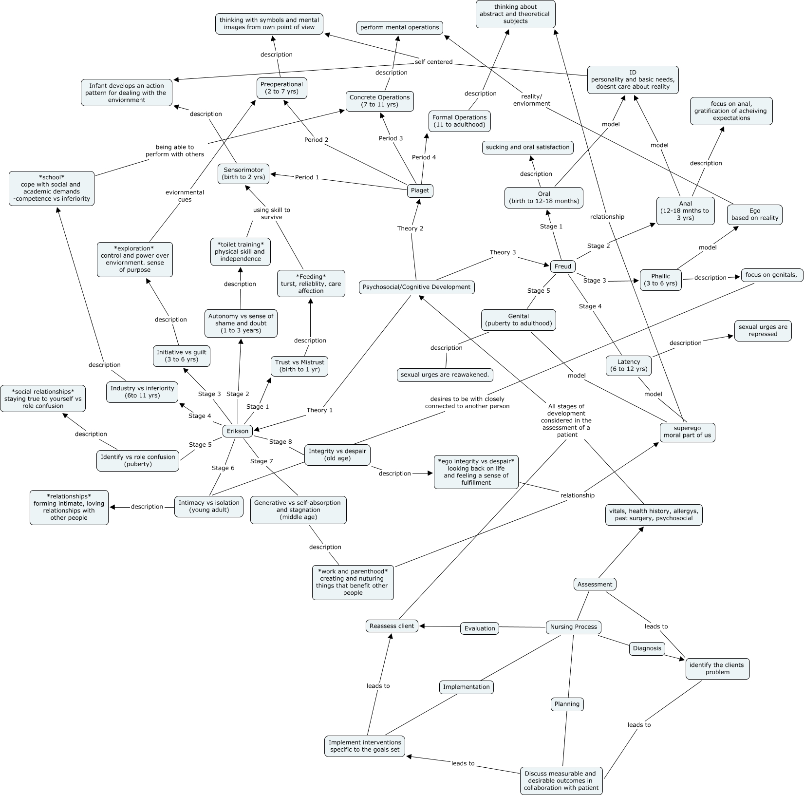 This Concept Map, created with IHMC CmapTools, has information related to: Developmental Parking Lot.cmap, Erikson Stage 5 Identify vs role confusion (puberty), Discuss measurable and desirable outcomes in collaboration with patient leads to Implement interventions specific to the goals set, Genital (puberty to adulthood) description sexual urges are reawakened., Nursing Process ???? Reassess client, *Feeding* turst, reliablity, care affection using skill to survive Sensorimotor (birth to 2 yrs), Piaget Period 4 Formal Operations (11 to adulthood), vitals, health history, allergys, past surgery, psychosocial All stages of development considered in the assessment of a patient Psychosocial/Cognitive Development, Nursing Process ???? vitals, health history, allergys, past surgery, psychosocial, Genital (puberty to adulthood) model superego moral part of us, Implement interventions specific to the goals set leads to Reassess client, ID personality and basic needs, doesnt care about reality self centered thinking with symbols and mental images from own point of view, Freud Stage 2 Anal (12-18 mnths to 3 yrs), Nursing Process ???? identify the clients problem, Identify vs role confusion (puberty) description *social relationships* staying true to yourself vs role confusion, focus on genitals, desires to be with closely connected to another person Intimacy vs isolation (young adult), Generative vs self-absorption and stagnation (middle age) description *work and parenthood* creating and nuturing things that benefit other people, Assessment leads to identify the clients problem, Anal (12-18 mnths to 3 yrs) model ID personality and basic needs, doesnt care about reality, Psychosocial/Cognitive Development Theory 3 Freud, Piaget Period 3 Concrete Operations (7 to 11 yrs)
