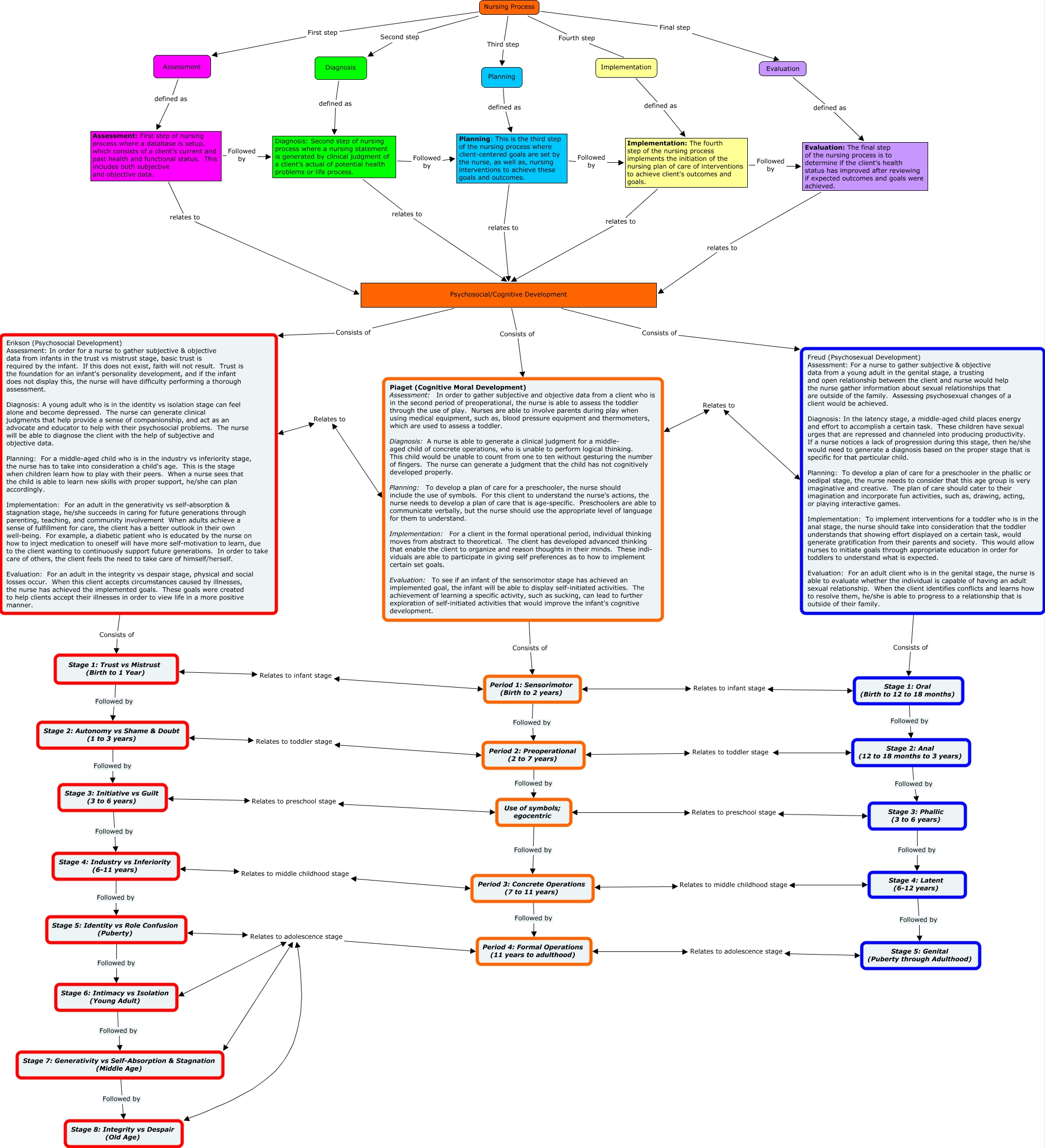 This Concept Map, created with IHMC CmapTools, has information related to: Developmental Parking Lot, Wong, V, Use of symbols; egocentric Relates to preschool stage Stage 3: Phallic (3 to 6 years), Stage 7: Generativity vs Self-Absorption & Stagnation (Middle Age) Followed by Stage 8: Integrity vs Despair (Old Age), Stage 1: Trust vs Mistrust (Birth to 1 Year) Relates to infant stage Period 1: Sensorimotor (Birth to 2 years), Stage 4: Industry vs Inferiority (6-11 years) Relates to middle childhood stage Period 3: Concrete Operations (7 to 11 years), Use of symbols; egocentric Followed by Period 3: Concrete Operations (7 to 11 years), Period 1: Sensorimotor (Birth to 2 years) Followed by Period 2: Preoperational (2 to 7 years), Stage 3: Initiative vs Guilt (3 to 6 years) Followed by Stage 4: Industry vs Inferiority (6-11 years), Stage 5: Identity vs Role Confusion (Puberty) Relates to adolescence stage Stage 6: Intimacy vs Isolation (Young Adult), Nursing Process Second step Diagnosis, Planning: This is the third step of the nursing process where client-centered goals are set by the nurse, as well as, nursing interventions to achieve these goals and outcomes. relates to Psychosocial/Cognitive Development, Diagnosis: Second step of nursing process where a nursing statement is generated by clinical judgment of a client's actual of potential health problems or life process. Followed by Planning: This is the third step of the nursing process where client-centered goals are set by the nurse, as well as, nursing interventions to achieve these goals and outcomes., Implementation: The fourth step of the nursing process implements the initiation of the nursing plan of care of interventions to achieve client's outcomes and goals. relates to Psychosocial/Cognitive Development, Stage 4: Industry vs Inferiority (6-11 years) Followed by Stage 5: Identity vs Role Confusion (Puberty), Stage 5: Identity vs Role Confusion (Puberty) Relates to adolescence stage Stage 8: Integrity vs Despair (Old Age), Period 4: Formal Operations (11 years to adulthood) Relates to adolescence stage Stage 5: Genital (Puberty through Adulthood), Stage 2: Anal (12 to 18 months to 3 years) Followed by Stage 3: Phallic (3 to 6 years), Erikson (Psychosocial Development) Assessment: In order for a nurse to gather subjective & objective data from infants in the trust vs mistrust stage, basic trust is required by the infant. If this does not exist, faith will not result. Trust is the foundation for an infant's personality development, and if the infant does not display this, the nurse will have difficulty performing a thorough assessment. Diagnosis: A young adult who is in the identity vs isolation stage can feel alone and become depressed. The nurse can generate clinical judgments that help provide a sense of companionship, and act as an advocate and educator to help with their psychosocial problems. The nurse will be able to diagnose the client with the help of subjective and objective data. Planning: For a middle-aged child who is in the industry vs inferiority stage, the nurse has to take into consideration a child's age. This is the stage when children learn how to play with their peers. When a nurse sees that the child is able to learn new skills with proper support, he/she can plan accordingly. Implementation: For an adult in the generativity vs self-absorption & stagnation stage, he/she succeeds in caring for future generations through parenting, teaching, and community involvement When adults achieve a sense of fulfillment for care, the client has a better outlook in their own well-being. For example, a diabetic patient who is educated by the nurse on how to inject medication to oneself will have more self-motivation to learn, due to the client wanting to continuously support future generations. In order to take care of others, the client feels the need to take care of himself/herself. Evaluation: For an adult in the integrity vs despair stage, physical and social losses occur. When this client accepts circumstances caused by illnesses, the nurse has achieved the implemented goals. These goals were created to help clients accept their illnesses in order to view life in a more positive manner. Consists of Stage 1: Trust vs Mistrust (Birth to 1 Year), Stage 5: Identity vs Role Confusion (Puberty) Relates to adolescence stage Stage 7: Generativity vs Self-Absorption & Stagnation (Middle Age), Nursing Process Third step Planning, Assessment defined as Assessment: First step of nursing process where a database is setup, which consists of a client's current and past health and functional status. This includes both subjective and objective data.