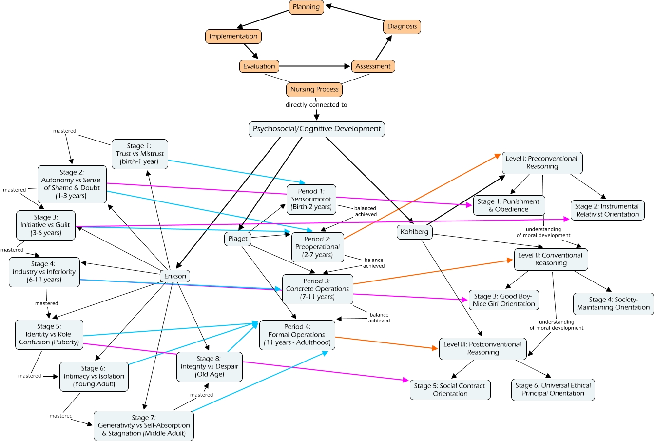 This Concept Map, created with IHMC CmapTools, has information related to: Developmental - E. Gerber, Erikson ???? Stage 1: Trust vs Mistrust (birth-1 year), Kohlberg ???? Level III: Postconventional Reasoning, Stage 2: Autonomy vs Sense of Shame & Doubt (1-3 years) ???? Stage 1: Punishment & Obedience, Stage 2: Autonomy vs Sense of Shame & Doubt (1-3 years) ???? Period 2: Preoperational (2-7 years), Erikson ???? Stage 2: Autonomy vs Sense of Shame & Doubt (1-3 years), Diagnosis ???? Planning, Stage 7: Generativity vs Self-Absorption & Stagnation (Middle Adult) mastered Stage 8: Integrity vs Despair (Old Age), Erikson ???? Stage 3: Initiative vs Guilt (3-6 years), Stage 1: Trust vs Mistrust (birth-1 year) ???? Period 1: Sensorimotot (Birth-2 years), Stage 1: Trust vs Mistrust (birth-1 year) mastered Stage 2: Autonomy vs Sense of Shame & Doubt (1-3 years), Piaget ???? Period 2: Preoperational (2-7 years), Period 2: Preoperational (2-7 years) ???? Level I: Preconventional Reasoning, Period 1: Sensorimotot (Birth-2 years) balanced achieved Period 2: Preoperational (2-7 years), Kohlberg ???? Level II: Conventional Reasoning, Nursing Process directly connected to Psychosocial/Cognitive Development, Erikson ???? Stage 4: Industry vs Inferiority (6-11 years), Stage 3: Initiative vs Guilt (3-6 years) mastered Stage 4: Industry vs Inferiority (6-11 years), Nursing Process ???? Assessment, Stage 5: Identity vs Role Confusion (Puberty) ???? Period 4: Formal Operations (11 years - Adulthood), Level III: Postconventional Reasoning ???? Stage 6: Universal Ethical Principal Orientation