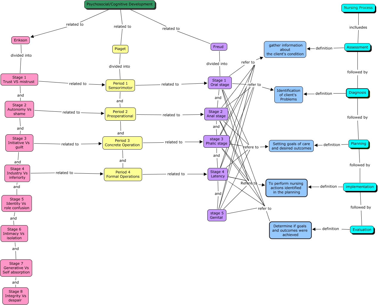 This Concept Map, created with IHMC CmapTools, has information related to: Henderson developmental, stage 3 Phalic stage refer to gather information about the client's condition, Planning definition Setting goals of care and desired outcomes, Planning followed by implementation, Stage 2 Autonomy Vs shame and Stage 3 Initiative Vs guilt, Stage 1 Oral stage and Stage 2 Anal stage, Stage 1 Oral stage refer to Determine if goals and outcomes were achieved, implementation definition To perform nursing actions identified in the planning, Freud divided into Stage 1 Oral stage, Stage 1 Oral stage refer to gather information about the client's condition, Period 2 Preoperational related to Stage 2 Anal stage, Piaget divided into Period 1 Sensorimotor, Stage 4 Latency refere to Setting goals of care and desired outcomes, Period 4 Formal Operations related to Stage 4 Latency, stage 5 Genital refer to Determine if goals and outcomes were achieved, stage 3 Phalic stage refer to Identification of client's Problems, Stage 2 Anal stage Refere to To perform nursing actions identified in the planning, Psychosocial/Cognitive Development related to Freud, Stage 4 Industry Vs inferiorty and Stage 5 Identity Vs role confusion, Assessment definition gather information about the client's condition, Stage 2 Anal stage refere to Setting goals of care and desired outcomes
