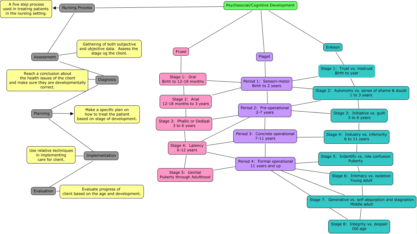 This Concept Map, created with IHMC CmapTools, has information related to: pendleton, development, Stage 2: Anal 12-18 months to 3 years ???? Period 1: Sensori-motor Birth to 2 years, Stage 1: Trust vs. mistrust Birth to year ???? Stage 3: Initiative vs. guilt 3 to 6 years, Stage 7: Generative vs. self-absorption and stagnation Middle adult ???? Period 4: Formal operational 11 years and up, Stage 1: Trust vs. mistrust Birth to year ???? Period 1: Sensori-motor Birth to 2 years, Stage 4: Latency 6-12 years ???? Period 2: Pre-operational 2-7 years, Stage 6: Intimacy vs. isolation Young adult ???? Stage 7: Generative vs. self-absorption and stagnation Middle adult, Stage 4: Latency 6-12 years ???? Stage 5: Genital Puberty through Adulthood, Evaluation ???? Evaluate progress of client based on the age and development., Stage 3: Phallic or Oedipal 3 to 6 years ???? Period 2: Pre-operational 2-7 years, Implementation ???? Evaluation, Period 2: Pre-operational 2-7 years ???? Period 3: Concrete operational 7-11 years, Implementation ???? Use relative techniques in implementing care for client., Diagnosis ???? Planning, Psychosocial/Cognitive Development ???? Erikson, Period 3: Concrete operational 7-11 years ???? Period 4: Formal operational 11 years and up, Diagnosis ???? Reach a conclusion about the health issues of the client and make sure they are developmentally correct., Stage 7: Generative vs. self-absorption and stagnation Middle adult ???? Stage 8: Integrity vs. despair Old age, Stage 6: Intimacy vs. isolation Young adult ???? Period 4: Formal operational 11 years and up, Psychosocial/Cognitive Development ???? Frued, Stage 2: Autonomy vs. sense of shame & doubt 1 to 3 years ???? Period 2: Pre-operational 2-7 years