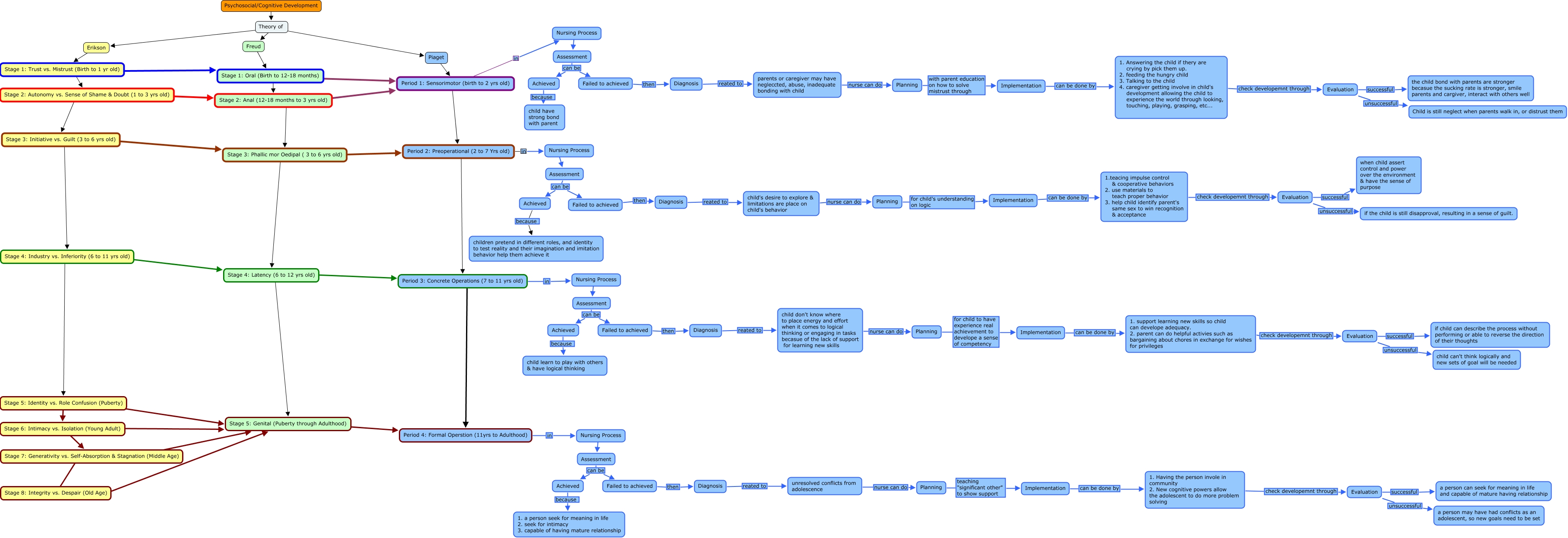 This Concept Map, created with IHMC CmapTools, has information related to: Developmental Parking Lot.cmap, Achieved because child learn to play with others & have logical thinking, Stage 2: Autonomy vs. Sense of Shame & Doubt (1 to 3 yrs old) ???? Stage 2: Anal (12-18 months to 3 yrs old), Stage 1: Trust vs. Mistrust (Birth to 1 yr old) ???? Stage 2: Autonomy vs. Sense of Shame & Doubt (1 to 3 yrs old), Stage 6: Intimacy vs. Isolation (Young Adult) ???? Stage 5: Genital (Puberty through Adulthood), child's desire to explore & limitations are place on child's behavior nurse can do Planning, Evaluation successful when child assert control and power over the environment & have the sense of purpose, Stage 3: Initiative vs. Guilt (3 to 6 yrs old) ???? Stage 3: Phallic mor Oedipal ( 3 to 6 yrs old), Nursing Process ???? Assessment, Achieved because child have strong bond with parent, Diagnosis reated to parents or caregiver may have negleccted, abuse, inadequate bonding with child, Planning teaching "significant other" to show support Implementation, Erikson ???? Stage 1: Trust vs. Mistrust (Birth to 1 yr old), Stage 3: Phallic mor Oedipal ( 3 to 6 yrs old) ???? Period 2: Preoperational (2 to 7 Yrs old), Stage 4: Latency (6 to 12 yrs old) ???? Stage 5: Genital (Puberty through Adulthood), Stage 8: Integrity vs. Despair (Old Age) ???? Stage 5: Genital (Puberty through Adulthood), Stage 4: Latency (6 to 12 yrs old) ???? Period 3: Concrete Operations (7 to 11 yrs old), unresolved conflicts from adolescence nurse can do Planning, Evaluation unsuccessful Child is still neglect when parents walk in, or distrust them, Period 3: Concrete Operations (7 to 11 yrs old) ???? Period 4: Formal Operstion (11yrs to Adulthood), Stage 3: Phallic mor Oedipal ( 3 to 6 yrs old) ???? Stage 4: Latency (6 to 12 yrs old)