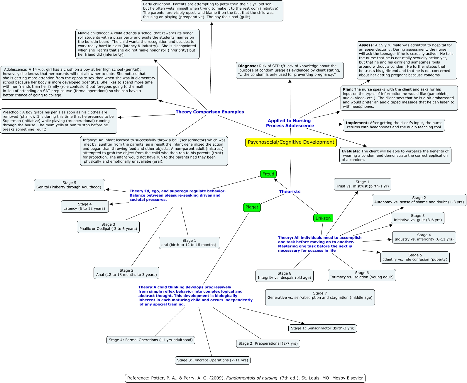 This Concept Map, created with IHMC CmapTools, has information related to: Developmental, Piaget Theory:A child thinking develops progressively from simple reflex behavior into complex logical and abstract thought. This development is biologically inherent in each maturing child and occurs independently of any special training. Stage 2: Preoperational (2-7 yrs), Freud Theory:Id, ego, and superego regulate behavior. Balance between pleasure-seeking drives and societal pressures. Stage 4 Latency (6 to 12 years), Psychosocial/Cognitive Development Theorists Erikson, Psychosocial/Cognitive Development Applied to Nursing Process Adolescence Diagnose: Risk of STD r/t lack of knowledge about the purpose of condom usage as evidenced by client stating, "...the condom is only used for preventing pregnancy.", Psychosocial/Cognitive Development Theory Comparison Examples Early childhood: Parents are attempting to potty train their 3 yr. old son, but he often wets himself when trying to make it to the restroom (initiative). The parents are visibly upset and blame it on the fact that the child was focusing on playing (preoperative). The boy feels bad (guilt)., Psychosocial/Cognitive Development Applied to Nursing Process Adolescence Plan: The nurse speaks with the client and asks for his input on the types of information he would like (pamphlets, audio, video, etc.). The client says that he is a bit embarassed and would prefer an audio taped message that he can listen to with headphones., Erikson Theory: All individuals need to accomplish one task before moving on to another. Mastering one task before the next is necesssary for success in life Stage 8 Integrity vs. despair (old age), Freud Theory:Id, ego, and superego regulate behavior. Balance between pleasure-seeking drives and societal pressures. Stage 1 oral (birth to 12 to 18 months), Erikson Theory: All individuals need to accomplish one task before moving on to another. Mastering one task before the next is necesssary for success in life Stage 1 Trust vs. mistrust (birth-1 yr), Piaget Theory:A child thinking develops progressively from simple reflex behavior into complex logical and abstract thought. This development is biologically inherent in each maturing child and occurs independently of any special training. Stage 4: Formal Operations (11 yrs-adulthood), Freud Theory:Id, ego, and superego regulate behavior. Balance between pleasure-seeking drives and societal pressures. Stage 5 Genital (Puberty through Adulthood), Freud Theory:Id, ego, and superego regulate behavior. Balance between pleasure-seeking drives and societal pressures. Stage 3 Phallic or Oedipal ( 3 to 6 years), Psychosocial/Cognitive Development Applied to Nursing Process Adolescence Evaluate: The client will be able to verbalize the benefits of wearing a condom and demonstrate the correct application of a condom., Psychosocial/Cognitive Development Theorists Piaget, Erikson Theory: All individuals need to accomplish one task before moving on to another. Mastering one task before the next is necesssary for success in life Stage 4 Industry vs. inferiority (6-11 yrs), Psychosocial/Cognitive Development Theorists Freud, Psychosocial/Cognitive Development Theory Comparison Examples Middle childhood: A child attends a school that rewards its honor roll students with a pizza party and posts the students' names on the bulletin board. The child wants the recognition and decides to work really hard in class (latency & industry). She is disappointed when she learns that she did not make honor roll (inferiority) but her friend did (inferiority)., Erikson Theory: All individuals need to accomplish one task before moving on to another. Mastering one task before the next is necesssary for success in life Stage 2 Autonomy vs. sense of shame and doubt (1-3 yrs), Erikson Theory: All individuals need to accomplish one task before moving on to another. Mastering one task before the next is necesssary for success in life Stage 7 Generative vs. self-absorption and stagnation (middle age), Freud Theory:Id, ego, and superego regulate behavior. Balance between pleasure-seeking drives and societal pressures. Stage 2 Anal (12 to 18 months to 3 years)