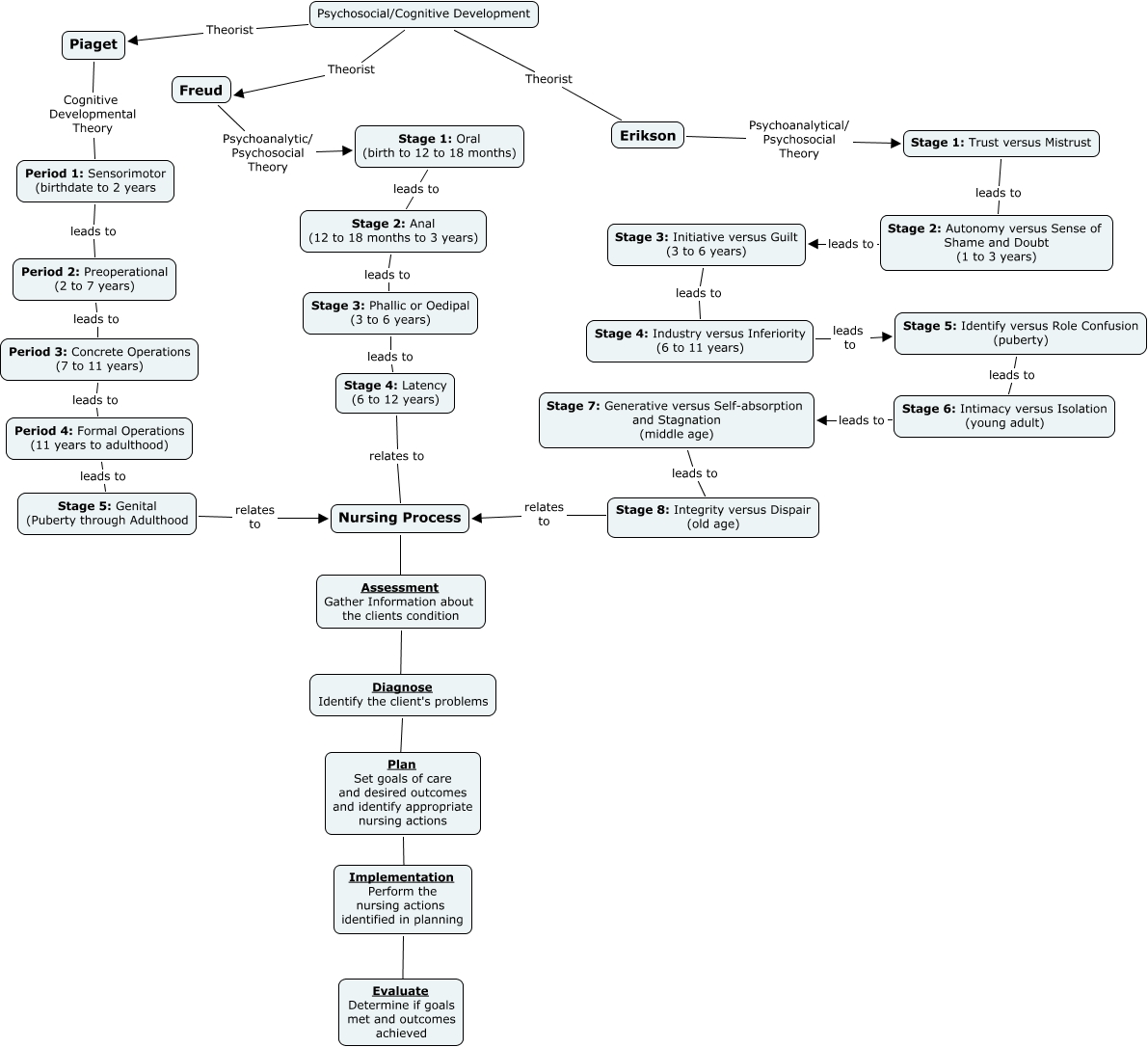 This Concept Map, created with IHMC CmapTools, has information related to: Development.Parking.Lot.CMAP, Implementation Perform the nursing actions identified in planning ???? Evaluate Determine if goals met and outcomes achieved, Assessment Gather Information about the clients condition ???? Diagnose Identify the client's problems, Stage 6: Intimacy versus Isolation (young adult) leads to Stage 7: Generative versus Self-absorption and Stagnation (middle age), Stage 4: Industry versus Inferiority (6 to 11 years) leads to Stage 5: Identify versus Role Confusion (puberty), Stage 3: Phallic or Oedipal (3 to 6 years) leads to Stage 4: Latency (6 to 12 years), Stage 8: Integrity versus Dispair (old age) relates to Nursing Process, Stage 1: Trust versus Mistrust leads to Stage 2: Autonomy versus Sense of Shame and Doubt (1 to 3 years), Period 3: Concrete Operations (7 to 11 years) leads to Period 4: Formal Operations (11 years to adulthood), Period 1: Sensorimotor (birthdate to 2 years leads to Period 2: Preoperational (2 to 7 years), Stage 4: Latency (6 to 12 years) relates to Nursing Process, Nursing Process ???? Assessment Gather Information about the clients condition, Stage 3: Initiative versus Guilt (3 to 6 years) leads to Stage 4: Industry versus Inferiority (6 to 11 years), Period 4: Formal Operations (11 years to adulthood) leads to Stage 5: Genital (Puberty through Adulthood, Plan Set goals of care and desired outcomes and identify appropriate nursing actions ???? Implementation Perform the nursing actions identified in planning, Stage 5: Identify versus Role Confusion (puberty) leads to Stage 6: Intimacy versus Isolation (young adult), Psychosocial/Cognitive Development Theorist Erikson, Diagnose Identify the client's problems ???? Plan Set goals of care and desired outcomes and identify appropriate nursing actions, Stage 1: Oral (birth to 12 to 18 months) leads to Stage 2: Anal (12 to 18 months to 3 years), Period 2: Preoperational (2 to 7 years) leads to Period 3: Concrete Operations (7 to 11 years), Freud Psychoanalytic/ Psychosocial Theory Stage 1: Oral (birth to 12 to 18 months)