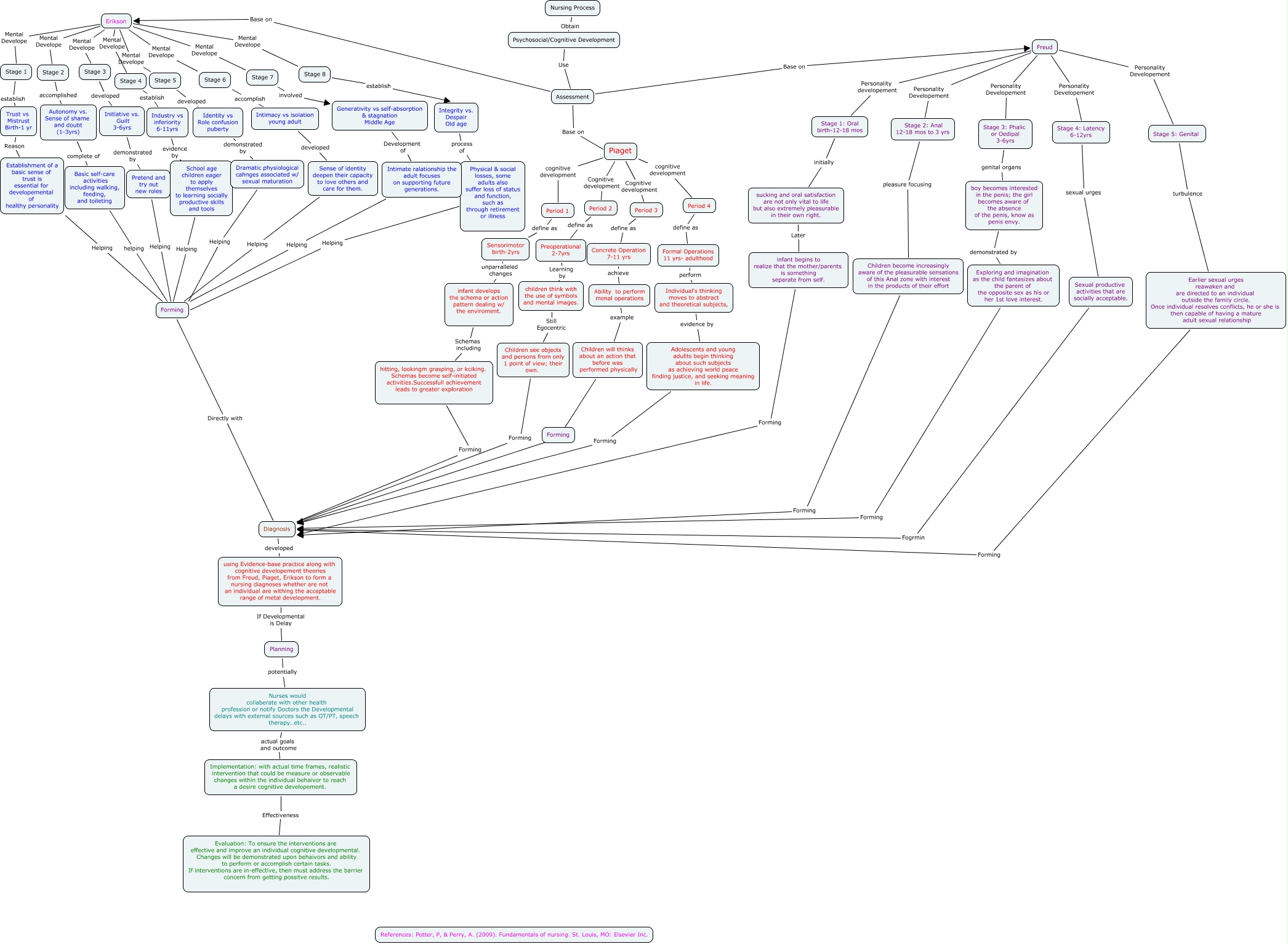 This Concept Map, created with IHMC CmapTools, has information related to: Developmental Parking Lot-Mai, sucking and oral satisfaction are not only vital to life but also extremely pleasurable in their own right. Later infant begins to realize that the mother/parents is something separate from self., Adolescents and young adullts begin thinking about such subjects as achieving world peace finding justice, and seeking meaning in life. Forming Diagnosis, boy becomes interested in the penis; the girl becomes aware of the absence of the penis, know as penis envy. demonstrated by Exploring and imagination as the child fantasizes about the parent of the opposite sex as his or her 1st love interest., Stage 3 developed Initiative vs. Guilt 3-6yrs, Autonomy vs. Sense of shame and doubt (1-3yrs) complete of Basic self-care activities including walking, feeding, and toileting, Intimate ralationship the adult focuses on supporting future generations. Helping Forming, Erikson Mental Develope Stage 1, Erikson Mental Develope Stage 5, Stage 1: Oral birth-12-18 mos initially sucking and oral satisfaction are not only vital to life but also extremely pleasurable in their own right., Diagnosis developed using Evidence-base practice along with cognitive developement theories from Freud, Piaget, Erikson to form a nursing diagnoses whether are not an individual are withing the acceptable range of metal development., Erikson Mental Develope Stage 4, Erikson Mental Develope Stage 6, using Evidence-base practice along with cognitive developement theories from Freud, Piaget, Erikson to form a nursing diagnoses whether are not an individual are withing the acceptable range of metal development. If Developmental is Delay Planning, Stage 2 accomplished Autonomy vs. Sense of shame and doubt (1-3yrs), Nurses would collaberate with other health profession or notify Doctors the Developmental delays with external sources such as OT/PT, speech therapy..etc.. actual goals and outcome Implementation: with actual time frames, realistic intervention that could be measure or observable changes within the individual behaivor to reach a desire cognitive developement., Assessment Base on Erikson, Stage 6 accomplish Intimacy vs isolation young adult, School age children eager to apply themselves to learning socially productive skills and tools Helping Forming, Assessment Base on Freud, Children will thinks about an action that before was performed physically ???? Diagnosis