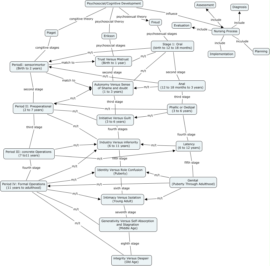 This Concept Map, created with IHMC CmapTools, has information related to: DevelopmentalParkingLot[2].cmap, Stage 1: Oral (birth to 12 to 18 months) second stage Anal (12 to 18 months to 3 years), Nursing Process include Implementation, Genital (Puberty Through Adulthood) m/t Identity Versus Role Confusion (Puberty), Industry Versus inferiority (6 to 11 years) fifth stage Identity Versus Role Confusion (Puberty), Stage 1: Oral (birth to 12 to 18 months) m/t Autonomy Versus Sense of Shame and doubt (1 to 3 years), Psychosocial/Cognitive Development psychosocial theroy Erikson, Period II: Preoperational (2 to 7 years) third stage Period III: concrete Operations (7 to11 years), Stage 1: Oral (birth to 12 to 18 months) m/t Trust Versus Mistrust (Birth to 1 year), Genital (Puberty Through Adulthood) m/t Period IV: Formal Operations (11 years to adulthood), Stage 1: Oral (birth to 12 to 18 months) m/t PeriodI: sensorimortor (Birth to 2 years), Period III: concrete Operations (7 to11 years) m/t Latency (6 to 12 years), Initiative Versus Guilt (3 to 6 years) fourth stages Industry Versus inferiority (6 to 11 years), PeriodI: sensorimortor (Birth to 2 years) match to Autonomy Versus Sense of Shame and doubt (1 to 3 years), Latency (6 to 12 years) m/t Industry Versus inferiority (6 to 11 years), Period IV: Formal Operations (11 years to adulthood) m/t Identity Versus Role Confusion (Puberty), Period II: Preoperational (2 to 7 years) m/t Industry Versus inferiority (6 to 11 years), Anal (12 to 18 months to 3 years) m/t PeriodI: sensorimortor (Birth to 2 years), Phallic or Oedipal (3 to 6 years) m/t Initiative Versus Guilt (3 to 6 years), Period III: concrete Operations (7 to11 years) m/t Industry Versus inferiority (6 to 11 years), Phallic or Oedipal (3 to 6 years) m/t Period II: Preoperational (2 to 7 years)
