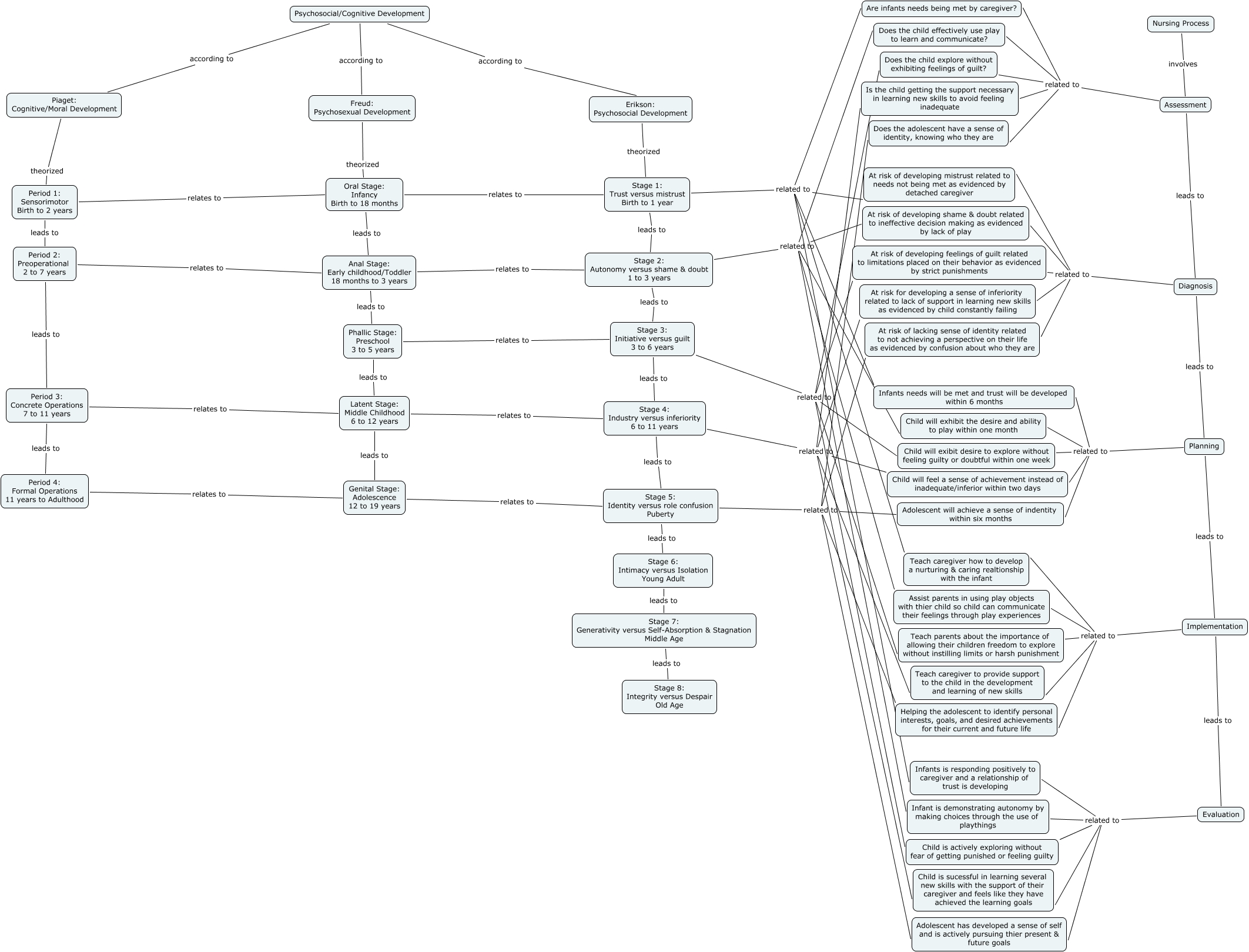 This Concept Map, created with IHMC CmapTools, has information related to: Theories-Jones, At risk of developing feelings of guilt related to limitations placed on their behavior as evidenced by strict punishments related to At risk for developing a sense of inferiority related to lack of support in learning new skills as evidenced by child constantly failing, Stage 2: Autonomy versus shame & doubt 1 to 3 years leads to Stage 3: Initiative versus guilt 3 to 6 years, Psychosocial/Cognitive Development according to Erikson: Psychosocial Development, Stage 5: Identity versus role confusion Puberty related to Helping the adolescent to identify personal interests, goals, and desired achievements for their current and future life, Anal Stage: Early childhood/Toddler 18 months to 3 years leads to Phallic Stage: Preschool 3 to 5 years, Child will exibit desire to explore without feeling guilty or doubtful within one week related to Child will exhibit the desire and ability to play within one month, Teach parents about the importance of allowing their children freedom to explore without instilling limits or harsh punishment related to Teach caregiver to provide support to the child in the development and learning of new skills, Stage 1: Trust versus mistrust Birth to 1 year related to Are infants needs being met by caregiver?, Stage 4: Industry versus inferiority 6 to 11 years related to Is the child getting the support necessary in learning new skills to avoid feeling inadequate, Does the child explore without exhibiting feelings of guilt? related to Is the child getting the support necessary in learning new skills to avoid feeling inadequate, At risk of developing feelings of guilt related to limitations placed on their behavior as evidenced by strict punishments related to Diagnosis, Stage 3: Initiative versus guilt 3 to 6 years leads to Stage 4: Industry versus inferiority 6 to 11 years, Stage 5: Identity versus role confusion Puberty related to Adolescent has developed a sense of self and is actively pursuing thier present & future goals, Stage 5: Identity versus role confusion Puberty leads to Stage 6: Intimacy versus Isolation Young Adult, Period 3: Concrete Operations 7 to 11 years relates to Latent Stage: Middle Childhood 6 to 12 years, Stage 4: Industry versus inferiority 6 to 11 years related to Child is sucessful in learning several new skills with the support of their caregiver and feels like they have achieved the learning goals, At risk of developing feelings of guilt related to limitations placed on their behavior as evidenced by strict punishments related to At risk of developing mistrust related to needs not being met as evidenced by detached caregiver, Evaluation related to Infants is responding positively to caregiver and a relationship of trust is developing, Child will exibit desire to explore without feeling guilty or doubtful within one week related to Child will feel a sense of achievement instead of inadequate/inferior within two days, Stage 2: Autonomy versus shame & doubt 1 to 3 years related to Does the child effectively use play to learn and communicate?