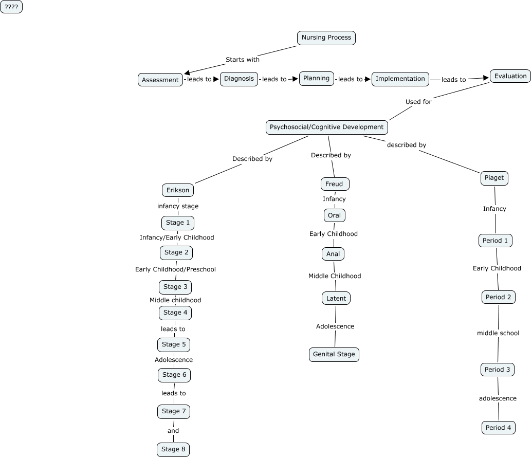 This Concept Map, created with IHMC CmapTools, has information related to: Psychosocial Cognitive Development Busch, Latent Adolescence Genital Stage, Evaluation Used for Psychosocial/Cognitive Development, Erikson infancy stage Stage 1, Stage 5 Adolescence Stage 6, Stage 2 Early Childhood/Preschool Stage 3, Nursing Process Starts with Assessment, Psychosocial/Cognitive Development Described by Freud, Period 2 middle school Period 3, Implementation leads to Evaluation, Planning leads to Implementation, Period 3 adolescence Period 4, Anal Middle Childhood Latent, Stage 1 Infancy/Early Childhood Stage 2, Psychosocial/Cognitive Development Described by Erikson, Diagnosis leads to Planning, Freud Infancy Oral, Stage 6 leads to Stage 7, Stage 7 and Stage 8, Stage 3 Middle childhood Stage 4, Piaget Infancy Period 1
