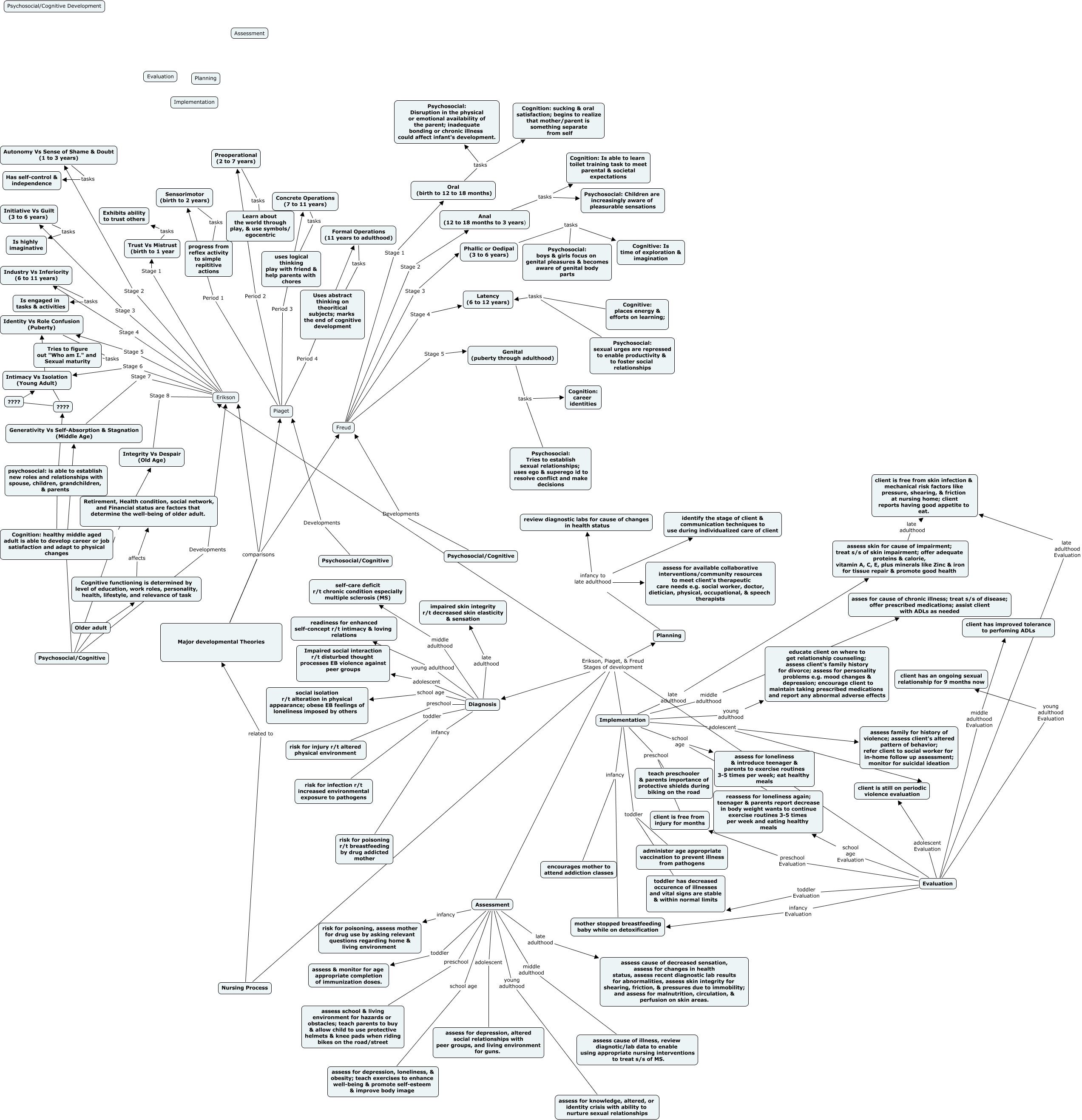 This Concept Map, created with IHMC CmapTools, has information related to: Developmental Parking Lot-Lawrence, A, Nursing Process Erikson, Piaget, & Freud Stages of development Planning, Planning infancy to late adulthood review diagnostic labs for cause of changes in health status, Cognitive: places energy & efforts on learning; tasks Latency (6 to 12 years), Implementation young adulthood educate client on where to get relationship counseling; assess client's family history for divorce; assess for personality problems e.g. mood changes & depression; encourage client to maintain taking prescribed medications and report any abnormal adverse effects, Implementation preschool teach preschooler & parents importance of protective shields during biking on the road, Phallic or Oedipal (3 to 6 years) tasks Psychosocial: boys & girls focus on genital pleasures & becomes aware of genital body parts, Assessment preschool assess school & living environment for hazards or obstacles; teach parents to buy & allow child to use protective helmets & knee pads when riding bikes on the road/street, Evaluation middle adulthood Evaluation client has improved tolerance to perfoming ADLs, Evaluation late adulthood Evaluation client is free from skin infection & mechanical risk factors like pressure, shearing, & friction at nursing home; client reports having good appetite to eat., Major developmental Theories comparisons Erikson, Diagnosis preschool risk for injury r/t altered physical environment, Trust Vs Mistrust (birth to 1 year tasks Exhibits ability to trust others, Evaluation infancy Evaluation mother stopped breastfeeding baby while on detoxification, Autonomy Vs Sense of Shame & Doubt (1 to 3 years) tasks Has self-control & independence, Psychosocial/Cognitive Cognitive functioning is determined by level of education, work roles, personality, health, lifestyle, and relevance of task, Nursing Process related to Major developmental Theories, Diagnosis infancy risk for poisoning r/t breastfeeding by drug addicted mother, Erikson Stage 8 Integrity Vs Despair (Old Age), Freud Stage 4 Latency (6 to 12 years), Implementation school age reassess for loneliness again; teenager & parents report decrease in body weight wants to continue exercise routines 3-5 times per week and eating healthy meals