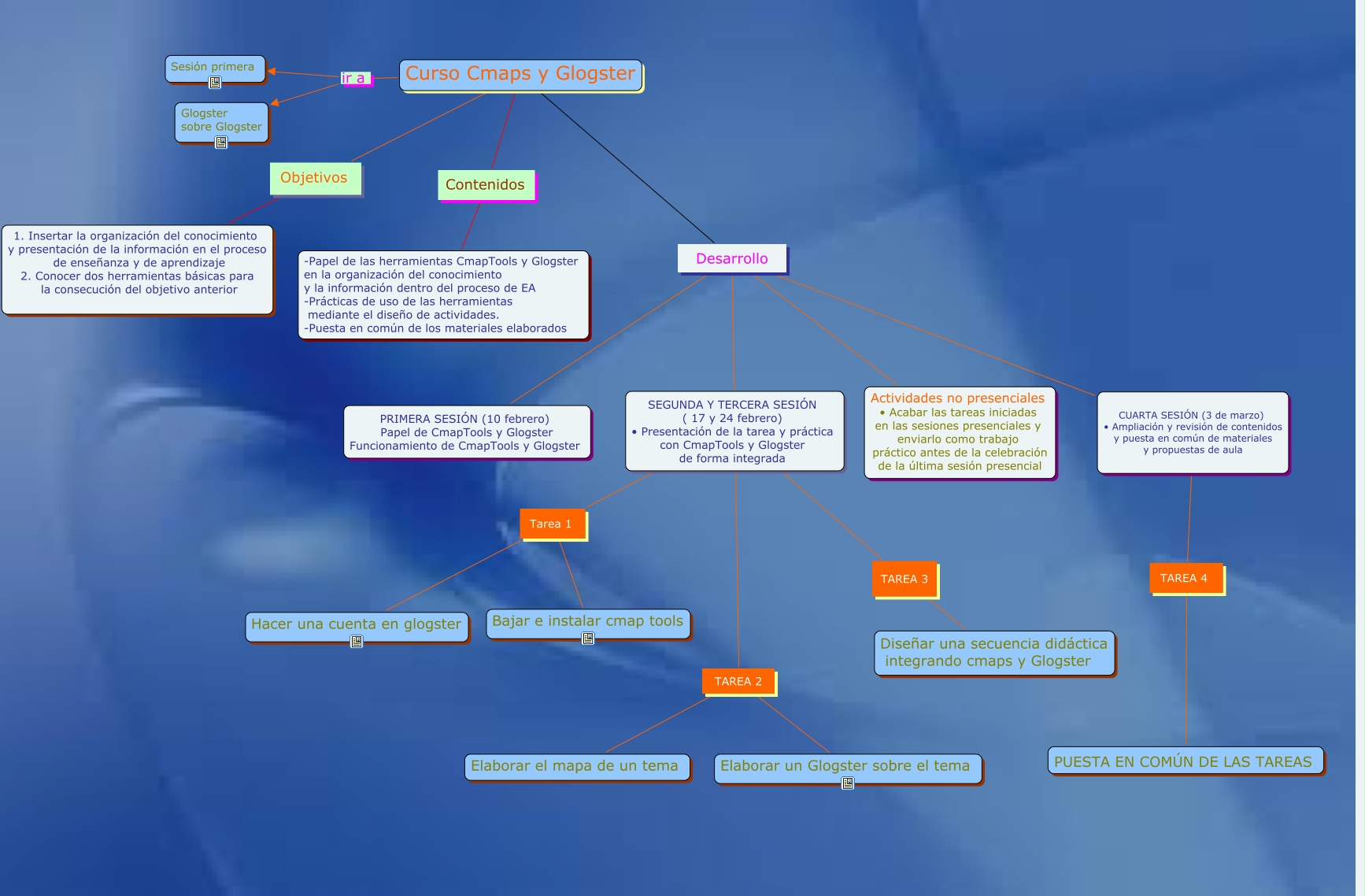 Este Cmap, tiene información relacionada con: presentacion_curso, Curso Cmaps y Glogster ir a Sesión primera, SEGUNDA Y TERCERA SESIÓN ( 17 y 24 febrero) • Presentación de la tarea y práctica con CmapTools y Glogster de forma integrada Tarea 1 Hacer una cuenta en glogster, SEGUNDA Y TERCERA SESIÓN ( 17 y 24 febrero) • Presentación de la tarea y práctica con CmapTools y Glogster de forma integrada TAREA 2 Elaborar un Glogster sobre el tema, Curso Cmaps y Glogster Contenidos -Papel de las herramientas CmapTools y Glogster en la organización del conocimiento y la información dentro del proceso de EA -Prácticas de uso de las herramientas mediante el diseño de actividades. -Puesta en común de los materiales elaborados, Curso Cmaps y Glogster Desarrollo PRIMERA SESIÓN (10 febrero) Papel de CmapTools y Glogster Funcionamiento de CmapTools y Glogster, Curso Cmaps y Glogster ir a Glogster sobre Glogster, Curso Cmaps y Glogster Objetivos 1. Insertar la organización del conocimiento y presentación de la información en el proceso de enseñanza y de aprendizaje 2. Conocer dos herramientas básicas para la consecución del objetivo anterior, Curso Cmaps y Glogster Desarrollo Actividades no presenciales • Acabar las tareas iniciadas en las sesiones presenciales y enviarlo como trabajo práctico antes de la celebración de la última sesión presencial, SEGUNDA Y TERCERA SESIÓN ( 17 y 24 febrero) • Presentación de la tarea y práctica con CmapTools y Glogster de forma integrada TAREA 3 Diseñar una secuencia didáctica integrando cmaps y Glogster, SEGUNDA Y TERCERA SESIÓN ( 17 y 24 febrero) • Presentación de la tarea y práctica con CmapTools y Glogster de forma integrada TAREA 2 Elaborar el mapa de un tema, CUARTA SESIÓN (3 de marzo) • Ampliación y revisión de contenidos y puesta en común de materiales y propuestas de aula TAREA 4 PUESTA EN COMÚN DE LAS TAREAS, Curso Cmaps y Glogster Desarrollo SEGUNDA Y TERCERA SESIÓN ( 17 y 24 febrero) • Presentación de la tarea y práctica con CmapTools y Glogster de forma integrada, Curso Cmaps y Glogster Desarrollo CUARTA SESIÓN (3 de marzo) • Ampliación y revisión de contenidos y puesta en común de materiales y propuestas de aula, SEGUNDA Y TERCERA SESIÓN ( 17 y 24 febrero) • Presentación de la tarea y práctica con CmapTools y Glogster de forma integrada Tarea 1 Bajar e instalar cmap tools