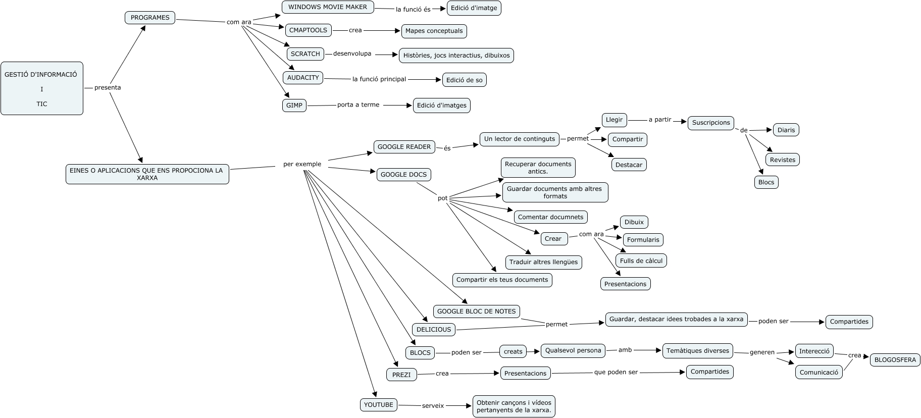 Este Cmap, tiene información relacionada con: MAPES CONCEPTUALS EINES I PROGRAMES, Crear com ara Dibuix, Un lector de continguts permet Destacar, Interecció crea Comunicació, YOUTUBE serveix Obtenir cançons i vídeos pertanyents de la xarxa., EINES O APLICACIONS QUE ENS PROPOCIONA LA XARXA per exemple DELICIOUS, Un lector de continguts permet Compartir, EINES O APLICACIONS QUE ENS PROPOCIONA LA XARXA per exemple PREZI, GOOGLE BLOC DE NOTES permet Guardar, destacar idees trobades a la xarxa, PROGRAMES com ara WINDOWS MOVIE MAKER, GESTIÓ D'INFORMACIÓ I TIC presenta EINES O APLICACIONS QUE ENS PROPOCIONA LA XARXA, Suscripcions de Revistes, GOOGLE DOCS pot Crear, GOOGLE DOCS pot Traduir altres llengües, Suscripcions de Blocs, SCRATCH desenvolupa Històries, jocs interactius, dibuixos, GESTIÓ D'INFORMACIÓ I TIC presenta PROGRAMES, PROGRAMES com ara GIMP, Presentacions que poden ser Compartides, Crear com ara Formularis, Suscripcions de Diaris