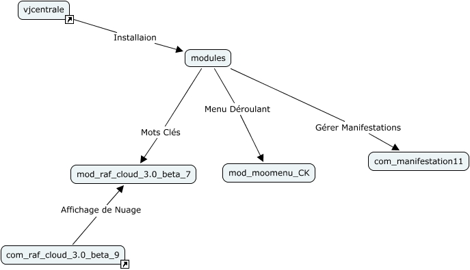 Cette carte de concepts créée avec IHMC CmapTools traite de: modules, modules Mots Clés mod_raf_cloud_3.0_beta_7, modules Gérer Manifestations com_manifestation11, modules Menu Déroulant mod_moomenu_CK, com_raf_cloud_3.0_beta_9 Affichage de Nuage mod_raf_cloud_3.0_beta_7, vjcentrale Installaion modules