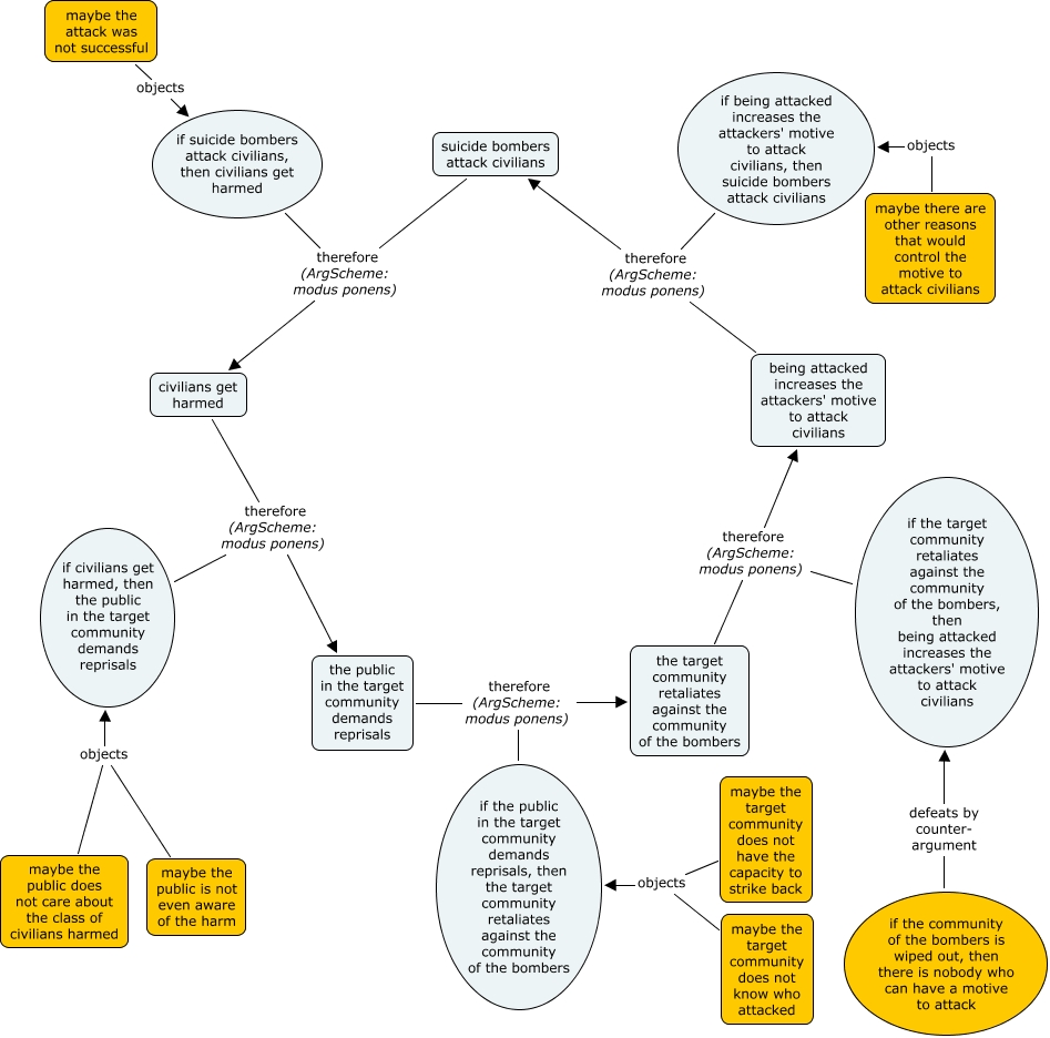 This Concept Map, created with IHMC CmapTools, has information related to: causal-loop-LAM-map-with-objections, civilians get harmed therefore (ArgScheme: modus ponens) the public in the target community demands reprisals, maybe the attack was not successful objects if suicide bombers attack civilians, then civilians get harmed, the public in the target community demands reprisals therefore (ArgScheme: modus ponens) the target community retaliates against the community of the bombers, if suicide bombers attack civilians, then civilians get harmed therefore (ArgScheme: modus ponens) civilians get harmed, maybe the target community does not know who attacked objects if the public in the target community demands reprisals, then the target community retaliates against the community of the bombers, suicide bombers attack civilians therefore (ArgScheme: modus ponens) civilians get harmed, if the public in the target community demands reprisals, then the target community retaliates against the community of the bombers therefore (ArgScheme: modus ponens) the target community retaliates against the community of the bombers, maybe there are other reasons that would control the motive to attack civilians objects if being attacked increases the attackers' motive to attack civilians, then suicide bombers attack civilians, maybe the public does not care about the class of civilians harmed objects if civilians get harmed, then the public in the target community demands reprisals, maybe the public is not even aware of the harm objects if civilians get harmed, then the public in the target community demands reprisals, the target community retaliates against the community of the bombers therefore (ArgScheme: modus ponens) being attacked increases the attackers' motive to attack civilians, being attacked increases the attackers' motive to attack civilians therefore (ArgScheme: modus ponens) suicide bombers attack civilians, if being attacked increases the attackers' motive to attack civilians, then suicide bombers attack civilians therefore (ArgScheme: modus ponens) suicide bombers attack civilians, maybe the target community does not have the capacity to strike back objects if the public in the target community demands reprisals, then the target community retaliates against the community of the bombers, if civilians get harmed, then the public in the target community demands reprisals therefore (ArgScheme: modus ponens) the public in the target community demands reprisals, if the community of the bombers is wiped out, then there is nobody who can have a motive to attack defeats by counter- argument if the target community retaliates against the community of the bombers, then being attacked increases the attackers' motive to attack civilians, if the target community retaliates against the community of the bombers, then being attacked increases the attackers' motive to attack civilians therefore (ArgScheme: modus ponens) being attacked increases the attackers' motive to attack civilians