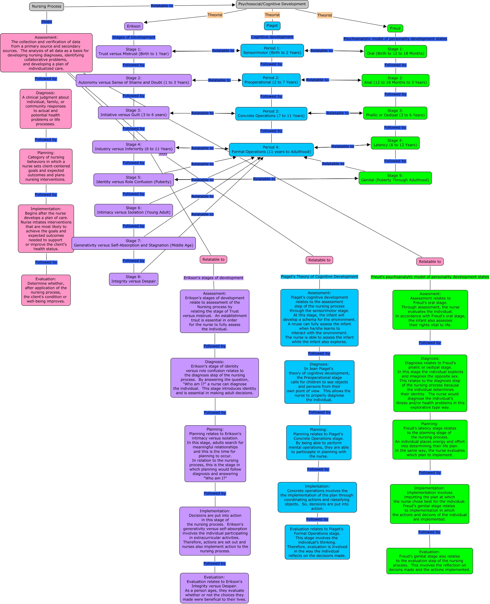 This Concept Map, created with IHMC CmapTools, has information related to: Developmental Parking lot- Blancaver, Implementation: Decisions are put into action in this stage of the nursing process. Erikson's generativity versus self-absorption involves the individual participating in extracurricular activities. Therefore, actions are set out and nurses also implement action to the nursing process. Followed by Evaluation: Evaluation relates to Erikson's Integrity versus Despair. As a person ages, they evaluate whether or not the choices they made were benefical to their lives., Stage 1: Oral (Birth to 12 to 18 Months) Relatable to Period 1: Sensorimotor (Birth to 2 Years), Period 1: Sensorimotor (Birth to 2 Years) Relatable to Stage 1: Trust versus Mistrust (Birth to 1 Year), Erikson Stages of Development Stage 1: Trust versus Mistrust (Birth to 1 Year), Period 2: Preoperational (2 to 7 Years) Followed by Period 3: Concrete Operations (7 to 11 Years), Planning: Category of nursing behaviors in which a nurse sets client-centered goals and expected outcomes and plans nursing interventions. Followed by Implementation: Begins after the nurse develops a plan of care. Nurse intiates interventions that are most likely to achieve the goals and expected outcomes needed to support or improve the client's health status., Diagnosis: A clinical judgment about individual, family, or community responses to actual and potential health problems or life processes. Followed by Planning: Category of nursing behaviors in which a nurse sets client-centered goals and expected outcomes and plans nursing interventions., Stage 4: Latency (6 to 12 Years) Relatable to Period 4: Formal Operations (11 years to Adulthood), Assesment: Assessment relates to Freud's oral stage. Through assessment, the nurse evaluates the individual. In accordance with Freud's oral stage, the infant also assesses their rights vital to life. Followed by Diagnosis: Diagnosis relates to Freud's phallic or oedipal stage. In this stage the individual explores and imagines the opposite sex. This relates to the diagnosis step of the nursing process because the individual determines their identity. The nurse would diagnose the individual's illness and/or health problems in this explorative type way., Assessment: The collection and verification of data from a primary source and secondary sources. The analysis of all data as a basis for developing nursing diagnoses, identifying collaborative problems, and developing a plan of individualized care. ???? Relatable to, Implementation: Implementation involves imputting the plan at which the nurse chose best for the individual. Freud's genital stage relates to implementation in which the actions and decions of the individual are implemented. Followed by Evaluation: Freud's genital stage also relates to the evaluation step of the nursing process. This involves the reflection on decions made and the actions implemented., Freud Psychoanalytic model of personality development states Stage 1: Oral (Birth to 12 to 18 Months), Assessment: The collection and verification of data from a primary source and secondary sources. The analysis of all data as a basis for developing nursing diagnoses, identifying collaborative problems, and developing a plan of individualized care. ???? Relatable to, Stage 5: Genital (Puberty Through Adulthood) Relatable to Stage 5: Identity versus Role Confusion (Puberty), Stage 6: Intimacy versus Isolation (Young Adult) Relatable to Period 4: Formal Operations (11 years to Adulthood), Planning: Planning relates to Erikson's intimacy versus isolation. In this stage, adults search for meaningful relationships and this is the time for planning to occur. In relation to the nursing process, this is the stage in which planning would follow diagnosis and answering "Who am I?" Followed by Implementation: Decisions are put into action in this stage of the nursing process. Erikson's generativity versus self-absorption involves the individual participating in extracurricular activities. Therefore, actions are set out and nurses also implement action to the nursing process., Planning: Freud's latency stage relates to the planning stage of the nursing process. An individual places energy and effort into determining their life plan. In the same way, the nurse evaluates which plan to implement. Followed by Implementation: Implementation involves imputting the plan at which the nurse chose best for the individual. Freud's genital stage relates to implementation in which the actions and decions of the individual are implemented., Stage 5: Identity versus Role Confusion (Puberty) Relatable to Period 4: Formal Operations (11 years to Adulthood), Stage 4: Latency (6 to 12 Years) Followed by Stage 5: Genital (Puberty Through Adulthood), Stage 2: Anal (12 to 18 Months to 3 Years) Relatable to Period 2: Preoperational (2 to 7 Years)