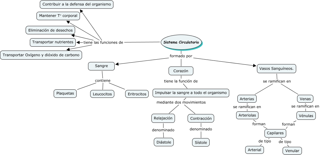 Este Cmap, tiene información relacionada con: mapa sistema circulatorio, Sistema Circulatorio tiene las funciones de Transportar Oxígeno y dióxido de carbono, Sistema Circulatorio tiene las funciones de Transportar nutrientes, Impulsar la sangre a todo el organismo mediante dos movimientos Contracción, Sangre contiene Plaquetas, Sistema Circulatorio tiene las funciones de Eliminación de desechos, Corazón tiene la función de Impulsar la sangre a todo el organismo, Relajación denominado Diástole, Contracción denominado Sístole, Sistema Circulatorio tiene las funciones de Contribuir a la defensa del organismo, Arterias se ramifican en Arteriolas, Capilares de tipo Venular, Sistema Circulatorio formado por Vasos Sanguíneos., Arteriolas forman Capilares, Sangre contiene Eritrocitos, Sistema Circulatorio formado por Corazón, Vénulas forman Capilares, Impulsar la sangre a todo el organismo mediante dos movimientos Relajación, Venas se ramifican en Vénulas, Sangre contiene Leucocitos, Sistema Circulatorio tiene las funciones de Mantener T° corporal