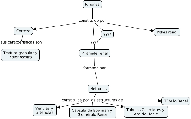 Este Cmap, tiene información relacionada con: Mapa sistema excretor o urinario, Nefronas constituida por las estructuras de Cápsula de Bowman y Glomérulo Renal, Pirámide renal formada por Nefronas, Riñónes constituido por Pelvis renal, Riñónes constituido por Pirámide renal, Riñónes constituido por Pirámide renal, Nefronas constituida por las estructuras de Túbulos Colectores y Asa de Henle, Nefronas constituida por las estructuras de Vénulas y arteriolas, Nefronas constituida por las estructuras de Túbulo Renal, ???? ???? Pirámide renal, Riñónes constituido por ????, Riñónes constituido por Corteza, Corteza sus características son Textura granular y color oscuro
