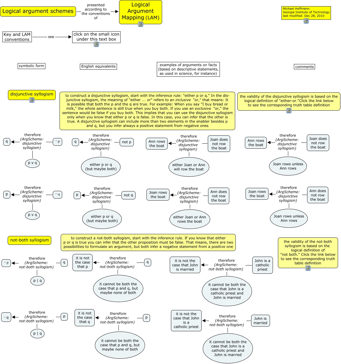 This Concept Map, created with IHMC CmapTools, has information related to: disjunctive not-both xor syllogism, p v q therefore (ArgScheme: disjunctive syllogism) q, it cannot be both the case that p and q, but maybe none of both therefore (ArgScheme: not-both syllogism) it is not the case that p, either Joan or Ann rows the boat therefore (ArgScheme: disjunctive syllogism) Ann does not row the boat, either p or q (but maybe both) therefore (ArgScheme: disjunctive syllogism) p, p therefore (ArgScheme: not-both syllogism) ¬ q, it cannot be both the case that p and q, but maybe none of both therefore (ArgScheme: not-both syllogism) q, p | q therefore (ArgScheme: not-both syllogism) ¬ p, q therefore (ArgScheme: not-both syllogism) ¬ p, it cannot be both the case that p and q, but maybe none of both therefore (ArgScheme: not-both syllogism) p, p | q therefore (ArgScheme: not-both syllogism) ¬ q, it cannot be both the case that John is a catholic priest and John is married therefore (ArgScheme: not-both syllogism) it is not the case that John is a catholic priest, ¬ q therefore (ArgScheme: disjunctive syllogism) p, ¬ p therefore (ArgScheme: disjunctive syllogism) q, not p therefore (ArgScheme: disjunctive syllogism) q, either p or q (but maybe both) therefore (ArgScheme: disjunctive syllogism) q, Joan rows unless Ann rows therefore (ArgScheme: disjunctive syllogism) Ann does not row the boat, either p or q (but maybe both) therefore (ArgScheme: disjunctive syllogism) not q, it cannot be both the case that John is a catholic priest and John is married therefore (ArgScheme: not-both syllogism) it is not the case that John is married, Joan rows unless Ann rows therefore (ArgScheme: disjunctive syllogism) Ann rows the boat, Logical argument schemes presented according to the conventions of Logical Argument Mapping (LAM)