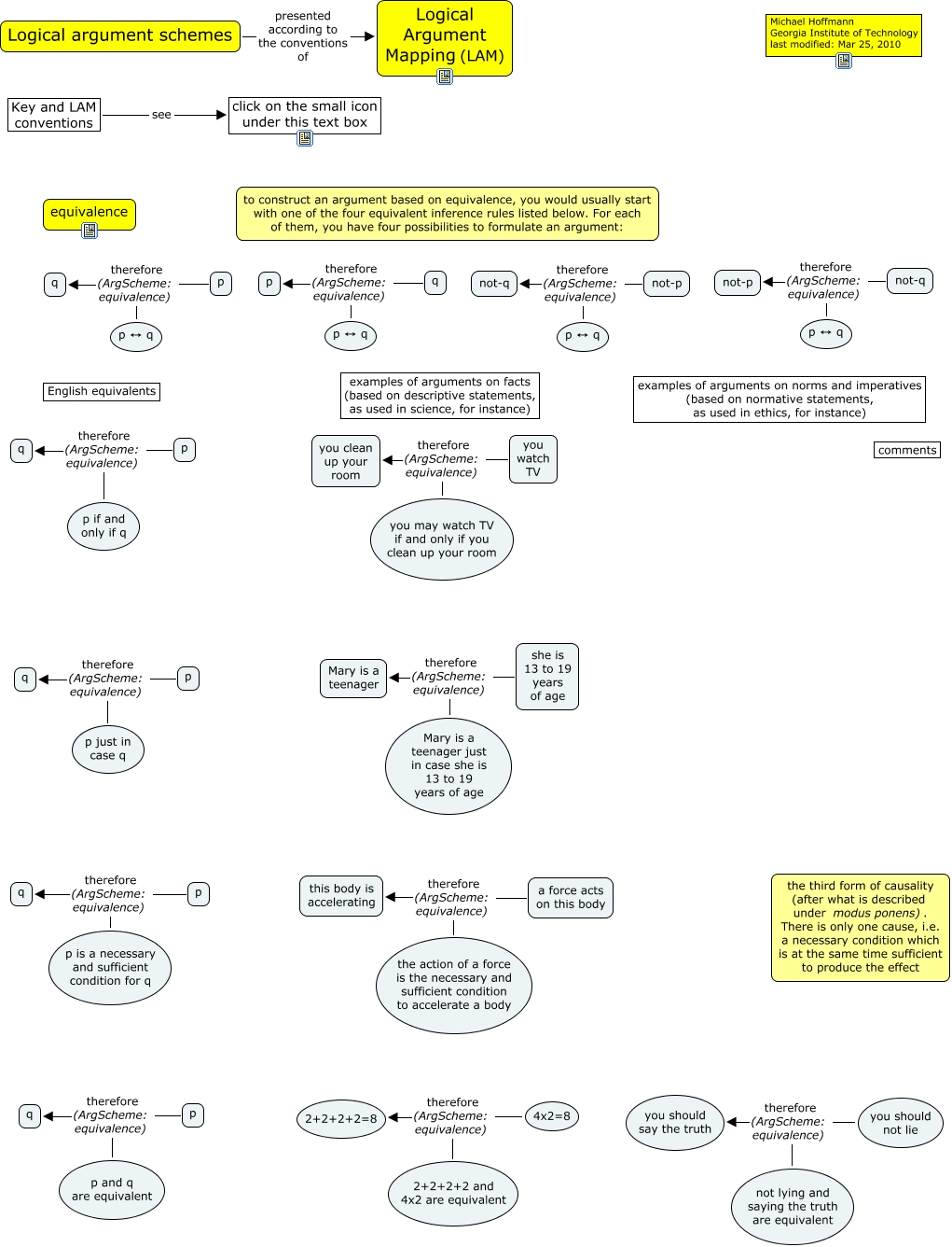 This Concept Map, created with IHMC CmapTools, has information related to: equivalence, you watch TV therefore (ArgScheme: equivalence) you clean up your room, she is 13 to 19 years of age therefore (ArgScheme: equivalence) Mary is a teenager, p therefore (ArgScheme: equivalence) q, p ↔ q therefore (ArgScheme: equivalence) q, p therefore (ArgScheme: equivalence) q, p ↔ q therefore (ArgScheme: equivalence) not-p, p if and only if q therefore (ArgScheme: equivalence) q, the action of a force is the necessary and sufficient condition to accelerate a body therefore (ArgScheme: equivalence) this body is accelerating, Key and LAM conventions see click on the small icon under this text box, p ↔ q therefore (ArgScheme: equivalence) not-q, not lying and saying the truth are equivalent therefore (ArgScheme: equivalence) you should say the truth, you should not lie therefore (ArgScheme: equivalence) you should say the truth, p therefore (ArgScheme: equivalence) q, p is a necessary and sufficient condition for q therefore (ArgScheme: equivalence) q, p ↔ q therefore (ArgScheme: equivalence) p, p therefore (ArgScheme: equivalence) q, not-p therefore (ArgScheme: equivalence) not-q, 2+2+2+2 and 4x2 are equivalent therefore (ArgScheme: equivalence) 2+2+2+2=8, Logical argument schemes presented according to the conventions of Logical Argument Mapping (LAM), 4x2=8 therefore (ArgScheme: equivalence) 2+2+2+2=8