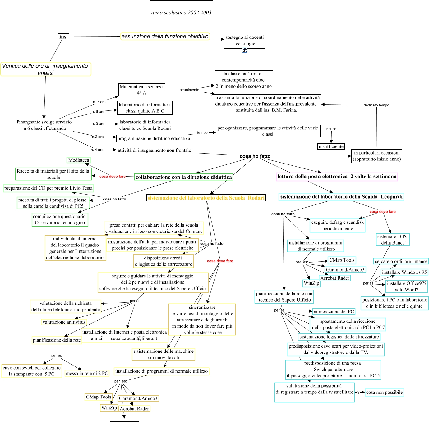 Este Cmap, tiene información relacionada con: ATTIVITA' INFORMATICA, l'insegnante svolge servizio in 6 classi effettuando n. 3 ore laboratorio di informatica classi terze Scuola Rodari, sistemazione del laboratorio della Scuola Leopardi cosa ho fatto eseguire defrag e scandisk periodicamente, sistemare 3 PC "della Banca" per es: installare Windows 95, installazione di programmi di normale utilizzo per es: Garamond/Amico3, pianificazione della rete con tecnico del Sapere Ufficio per es. predisposizione di una presa Swich per alternare il passaggio videoproiettore - monitor su PC 5, sistemazione del laboratorio della Scuola Rodari cosa ho fatto preso contatti per cablare la rete della scuola e valutazione in loco con elettricista del Comune, collaborazione con la direzione didattica cosa devo fare Raccolta di materiali per il sito della scuola, seguire e guidare le attivita di montaggio dei 2 pc nuovi e di installazione software che ha eseguito il tecnico del Sapere Ufficio. per es. installazione di Internet e posta elettronica e-mail: scuola.rodari@libero.it, ins. assunzione della funzione obiettivo sostegno ai docenti tecnologie, attività di insegnamento non frontale cosa ho fatto sistemazione del laboratorio della Scuola Rodari, preso contatti per cablare la rete della scuola e valutazione in loco con elettricista del Comune individuata all'interno del laboratorio il quadro generale per l'interruzione dell'elettricità nel laboratorio., sistemazione del laboratorio della Scuola Leopardi cosa ho fatto pianificazione della rete con tecnico del Sapere Ufficio, pianificazione della rete per es: messa in rete di 2 PC, sistemare 3 PC "della Banca" per es: installare Office97? solo Word?, Matematica e scienze 4° A attualmente ha assunto la funzione di coordinamento delle attività didattico educative per l'assenza dell'ins.prevalente sostituita dall'ins. B.M. Farina., pianificazione della rete con tecnico del Sapere Ufficio per es. spostamento della ricezione della posta elettronica da PC1 a PC7, seguire e guidare le attivita di montaggio dei 2 pc nuovi e di installazione software che ha eseguito il tecnico del Sapere Ufficio. per es. valutazione anitivirus, in particolari occasioni (soprattutto inizio anno) dedicato tempo ha assunto la funzione di coordinamento delle attività didattico educative per l'assenza dell'ins.prevalente sostituita dall'ins. B.M. Farina., valutazione della possibilità di registrare a tempo dalla tv satellitare ? cosa non possibile, pianificazione della rete per es: cavo con swich per collegare la stampante con 5 PC