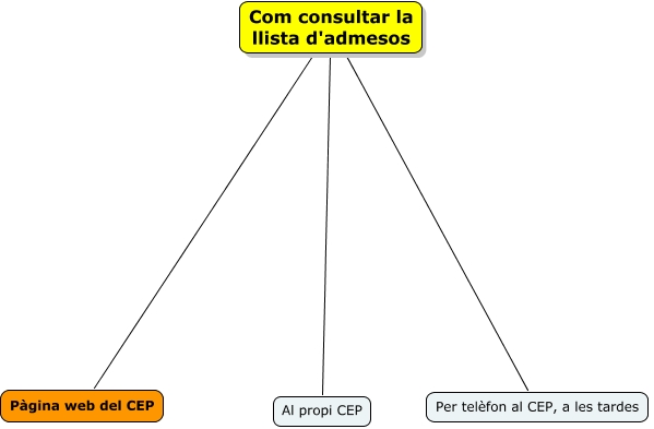 Aquest mapa conceptual conté informació relacionada amb: Consultar llista d'admesos, Com consultar la llista d'admesos Al propi CEP, Com consultar la llista d'admesos Pàgina web del CEP, Com consultar la llista d'admesos Per telèfon al CEP, a les tardes