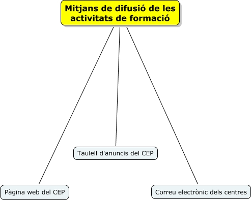 Aquest mapa conceptual conté informació relacionada amb: Difusió activitats de formació, Mitjans de difusió de les activitats de formació Correu electrònic dels centres, Mitjans de difusió de les activitats de formació Taulell d'anuncis del CEP, Mitjans de difusió de les activitats de formació Pàgina web del CEP