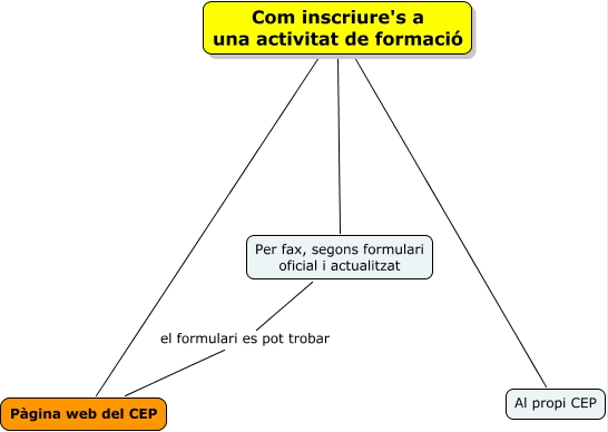 Aquest mapa conceptual conté informació relacionada amb: Inscriure's a activitat de formació, Com inscriure's a una activitat de formació Al propi CEP, Com inscriure's a una activitat de formació Pàgina web del CEP, Com inscriure's a una activitat de formació Per fax, segons formulari oficial i actualitzat, Per fax, segons formulari oficial i actualitzat el formulari es pot trobar Pàgina web del CEP