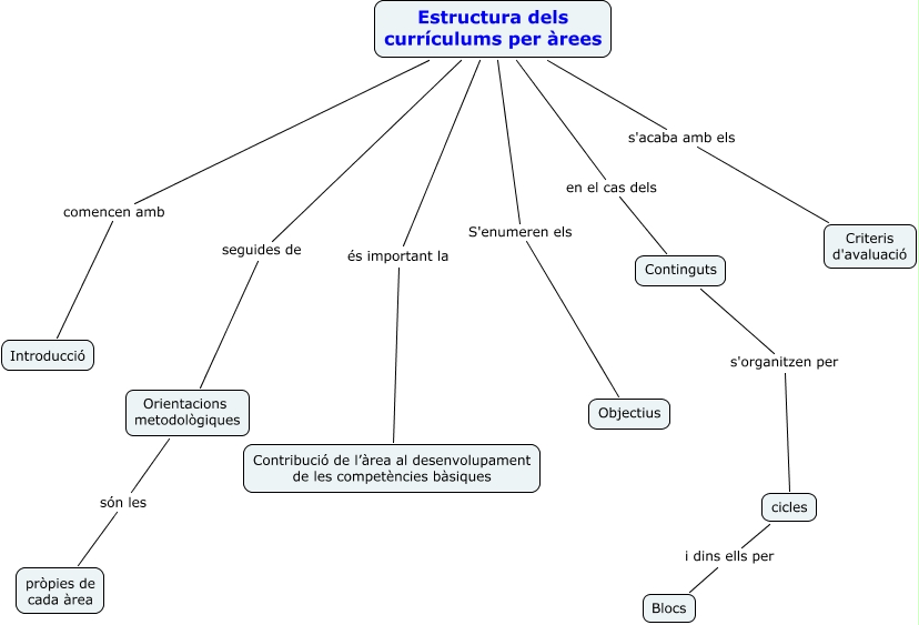 Aquest mapa conceptual conté informació relacionada amb: Estructura currículum per àrees, Estructura dels currículums per àrees S'enumeren els Objectius, cicles i dins ells per Blocs, Estructura dels currículums per àrees en el cas dels Continguts, Continguts s'organitzen per cicles, Orientacions metodològiques són les pròpies de cada àrea, Estructura dels currículums per àrees comencen amb Introducció, Estructura dels currículums per àrees s'acaba amb els Criteris d'avaluació, Estructura dels currículums per àrees seguides de Orientacions metodològiques, Estructura dels currículums per àrees és important la Contribució de l’àrea al desenvolupament de les competències bàsiques