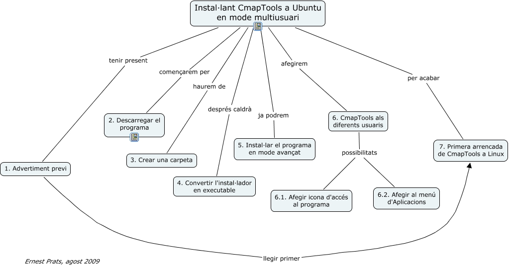 Aquest mapa conceptual conté informació relacionada amb: Multiusuari Linux, Instal·lant CmapTools a Ubuntu en mode multiusuari afegirem 6. CmapTools als diferents usuaris, Instal·lant CmapTools a Ubuntu en mode multiusuari haurem de 3. Crear una carpeta, Instal·lant CmapTools a Ubuntu en mode multiusuari començarem per 2. Descarregar el programa, Instal·lant CmapTools a Ubuntu en mode multiusuari per acabar 7. Primera arrencada de CmapTools a Linux, Instal·lant CmapTools a Ubuntu en mode multiusuari ja podrem 5. Instal·lar el programa en mode avançat, 6. CmapTools als diferents usuaris possibilitats 6.1. Afegir icona d'accés al programa, Instal·lant CmapTools a Ubuntu en mode multiusuari després caldrà 4. Convertir l'instal·lador en executable, 6. CmapTools als diferents usuaris possibilitats 6.2. Afegir al menú d'Aplicacions, 1. Advertiment previ llegir primer 7. Primera arrencada de CmapTools a Linux, Instal·lant CmapTools a Ubuntu en mode multiusuari tenir present 1. Advertiment previ