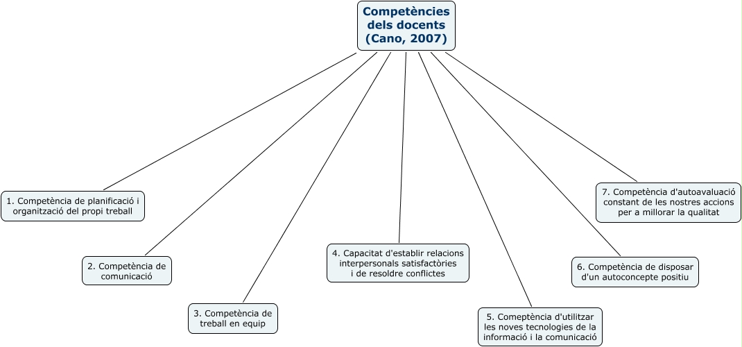 Aquest mapa conceptual conté informació relacionada amb: Competències dels docents, Competències dels docents (Cano, 2007) 4. Capacitat d'establir relacions interpersonals satisfactòries i de resoldre conflictes, Competències dels docents (Cano, 2007) 7. Competència d'autoavaluació constant de les nostres accions per a millorar la qualitat, Competències dels docents (Cano, 2007) 2. Competència de comunicació, Competències dels docents (Cano, 2007) 1. Competència de planificació i organització del propi treball, Competències dels docents (Cano, 2007) 6. Competència de disposar d'un autoconcepte positiu, Competències dels docents (Cano, 2007) 3. Competència de treball en equip, Competències dels docents (Cano, 2007) 5. Comeptència d'utilitzar les noves tecnologies de la informació i la comunicació