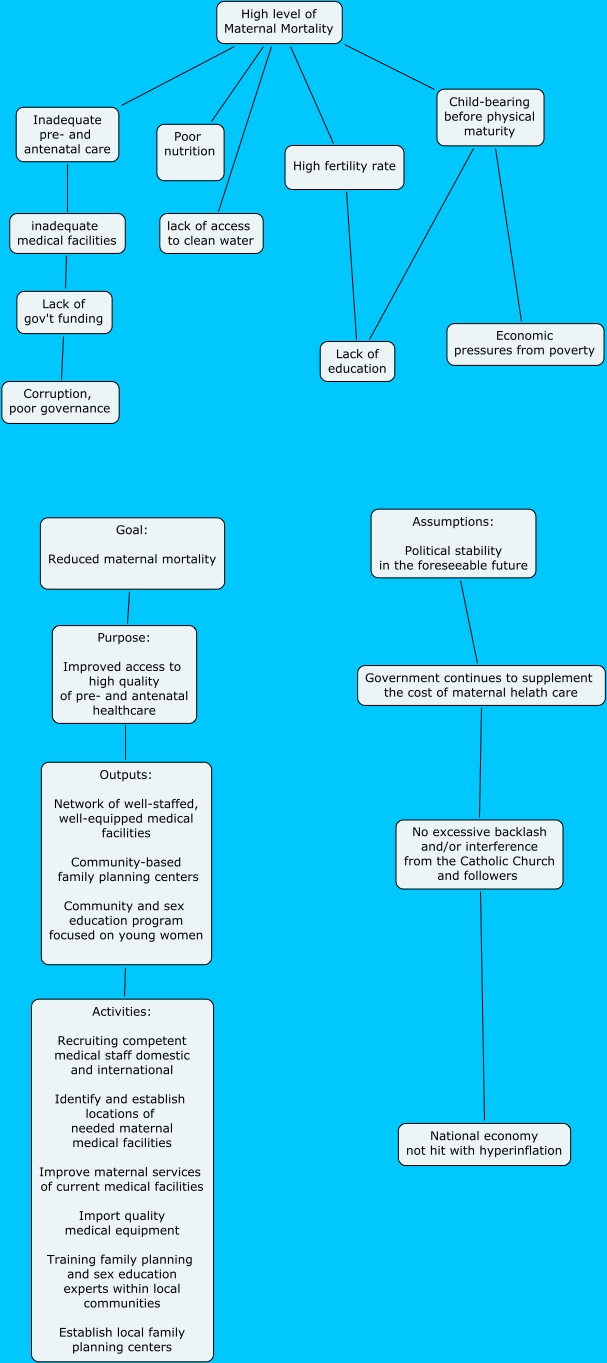 This Concept Map, created with IHMC CmapTools, has information related to: Honduras4, High fertility rate Lack of education, Child-bearing before physical maturity High level of Maternal Mortality, High level of Maternal Mortality Poor nutrition, No excessive backlash and/or interference from the Catholic Church and followers National economy not hit with hyperinflation, Child-bearing before physical maturity Lack of education, Goal: Reduced maternal mortality Purpose: Improved access to high quality of pre- and antenatal healthcare, Inadequate pre- and antenatal care inadequate medical facilities, Child-bearing before physical maturity Economic pressures from poverty, High level of Maternal Mortality Inadequate pre- and antenatal care, Lack of gov't funding Corruption, poor governance, High level of Maternal Mortality High fertility rate, Purpose: Improved access to high quality of pre- and antenatal healthcare Outputs: Network of well-staffed, well-equipped medical facilities Community-based family planning centers Community and sex education program focused on young women, High level of Maternal Mortality lack of access to clean water, inadequate medical facilities Lack of gov't funding, Assumptions: Political stability in the foreseeable future Government continues to supplement the cost of maternal helath care, Government continues to supplement the cost of maternal helath care No excessive backlash and/or interference from the Catholic Church and followers, Outputs: Network of well-staffed, well-equipped medical facilities Community-based family planning centers Community and sex education program focused on young women Activities: Recruiting competent medical staff domestic and international Identify and establish locations of needed maternal medical facilities Improve maternal services of current medical facilities Import quality medical equipment Training family planning and sex education experts within local communities Establish local family planning centers