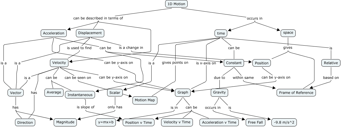 This Concept Map, created with IHMC CmapTools, has information related to: 1D Motion - Rabaioli, Velocity can be seen on Motion Map, Acceleration can be Constant, Velocity can be Average, Vector has Direction, Velocity can be Instantaneous, time is a Scalar, Scalar only has Magnitude, space gives Frame of Reference, Acceleration can be y-axis on Graph, Relative based on Frame of Reference, Constant within same Frame of Reference, Displacement is a Vector, time is Relative, Constant due to Gravity, time is x-axis on Graph, time can be Constant, Gravity is -9.8 m/s^2, Velocity is a Vector, 1D Motion can be described in terms of Velocity, Graph can be Position v Time