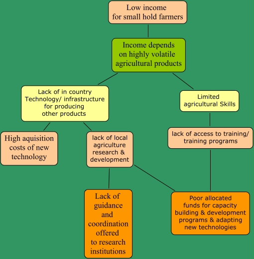 This Concept Map, created with IHMC CmapTools, has information related to: Untitled, lack of access to training/ training programs Poor allocated funds for capacity building & development programs & adapting new technologies, Income depends on highly volatile agricultural products Limited agricultural Skills, Low income for small hold farmers Income depends on highly volatile agricultural products, Lack of in country Technology/ infrastructure for producing other products lack of local agriculture research & development, lack of local agriculture research & development Lack of guidance and coordination offered to research institutions, lack of local agriculture research & development Poor allocated funds for capacity building & development programs & adapting new technologies, Lack of in country Technology/ infrastructure for producing other products High aquisition costs of new technology, Limited agricultural Skills lack of access to training/ training programs, Income depends on highly volatile agricultural products Lack of in country Technology/ infrastructure for producing other products
