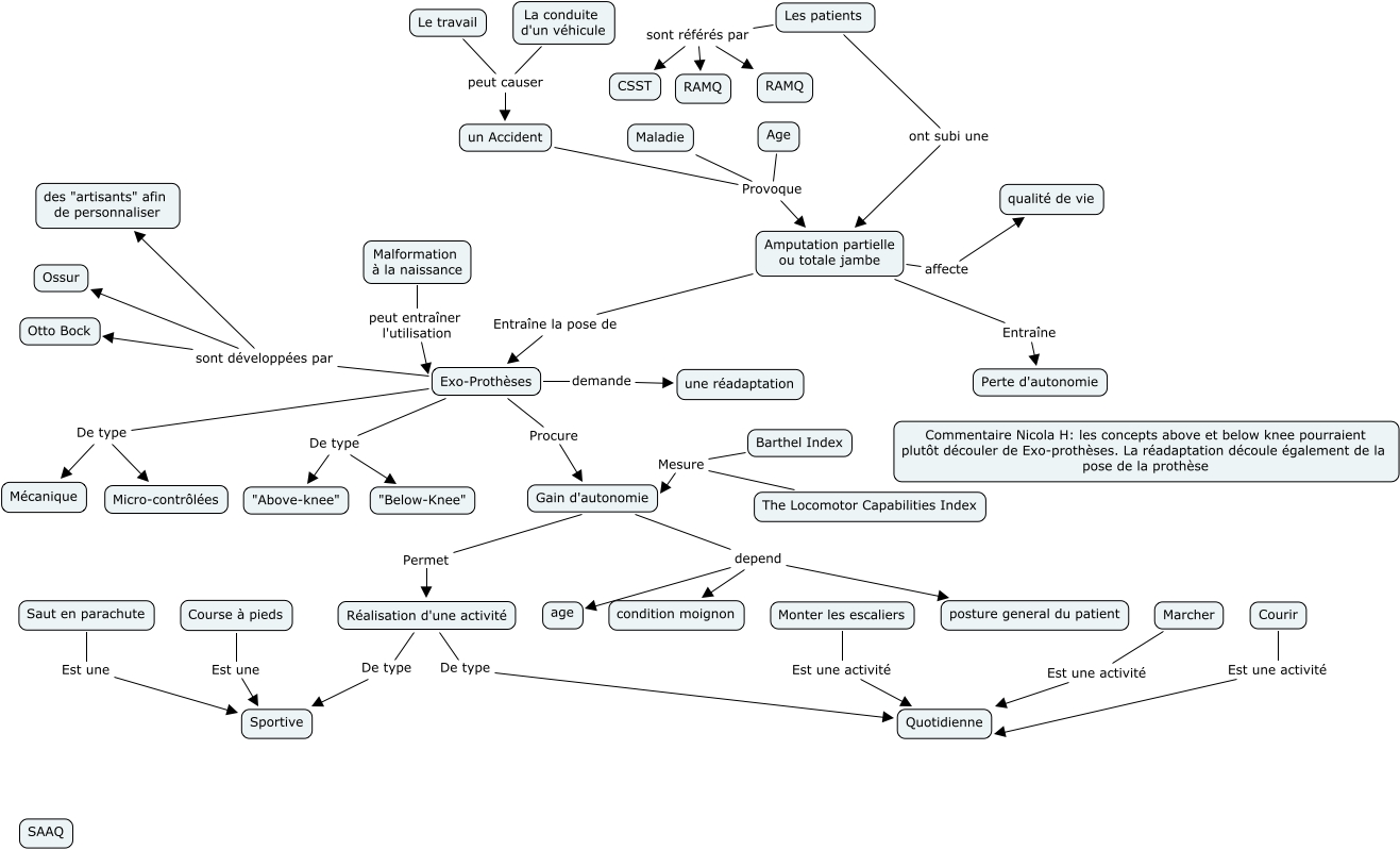 This Concept Map, created with IHMC CmapTools, has information related to: ExoProthese_02, Exo-Prothèses sont développées par des "artisants" afin de personnaliser, Marcher Est une activité Quotidienne, un Accident Provoque Amputation partielle ou totale jambe, Courir Est une activité Quotidienne, Gain d'autonomie depend posture general du patient, Age Provoque Amputation partielle ou totale jambe, Les patients sont référés par CSST, Exo-Prothèses De type Micro-contrôlées, Exo-Prothèses De type "Above-knee", Réalisation d'une activité De type Sportive, Amputation partielle ou totale jambe Entraîne la pose de Exo-Prothèses, Exo-Prothèses De type Mécanique, Les patients sont référés par RAMQ, Réalisation d'une activité De type Quotidienne, Malformation à la naissance peut entraîner l'utilisation Exo-Prothèses, Monter les escaliers Est une activité Quotidienne, Exo-Prothèses De type "Below-Knee", Saut en parachute Est une Sportive, Les patients ont subi une Amputation partielle ou totale jambe, Course à pieds Est une Sportive